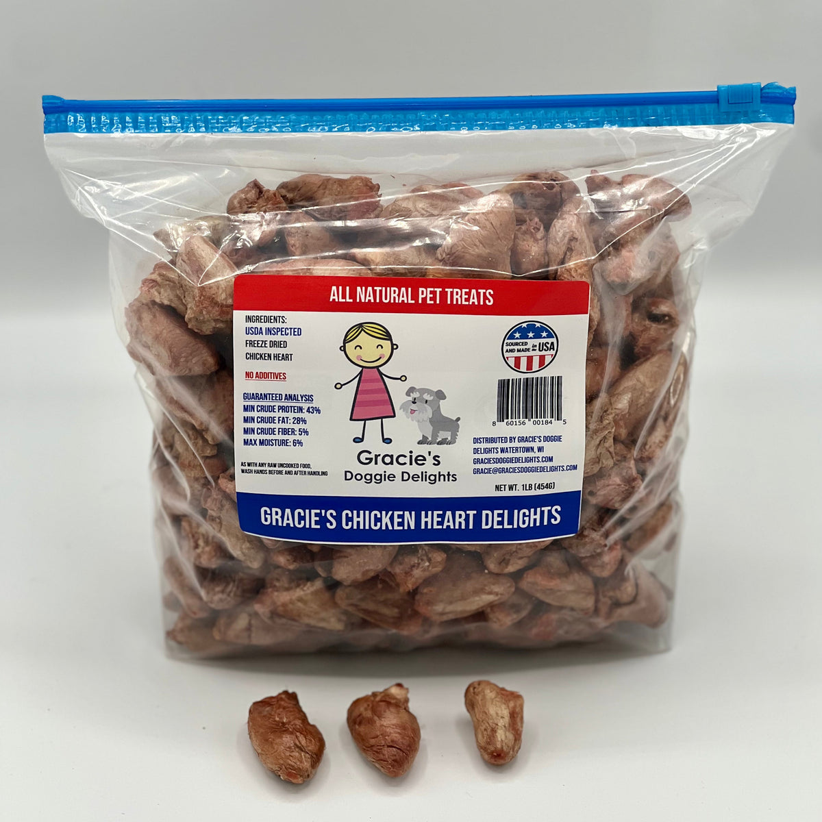 Like all our treats, Gracie's Chicken Heart Delights are USDA inspected meat freeze dried raw with no additives. The slow freeze drying process locks in the delicious flavor that pets crave with no grains, gluten, chemicals or preservatives. It's a raw food treat without the mess. They're the treats pets love and you'll love giving.