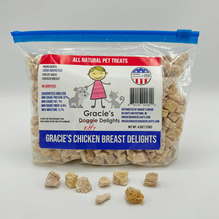 Like all our treats, Gracie's Chicken Breast Delights are freeze dried raw with no additives. The slow freeze drying process locks in the delicious flavor that pets crave with no grains, gluten, chemicals or preservatives. It's a raw food treat without the mess. They're the treats pets love and you'll love giving.