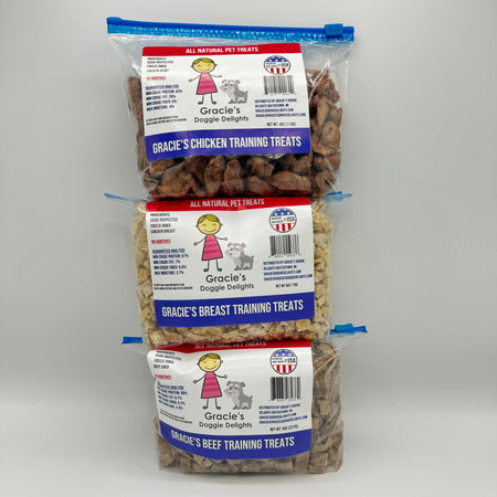 Gracie's Training Treats come in three different flavors. These freeze dried treats are great for training your dog because they are small and are perfect for when multiple treats are needed for training. They are also great for smaller dogs, puppies or cats.