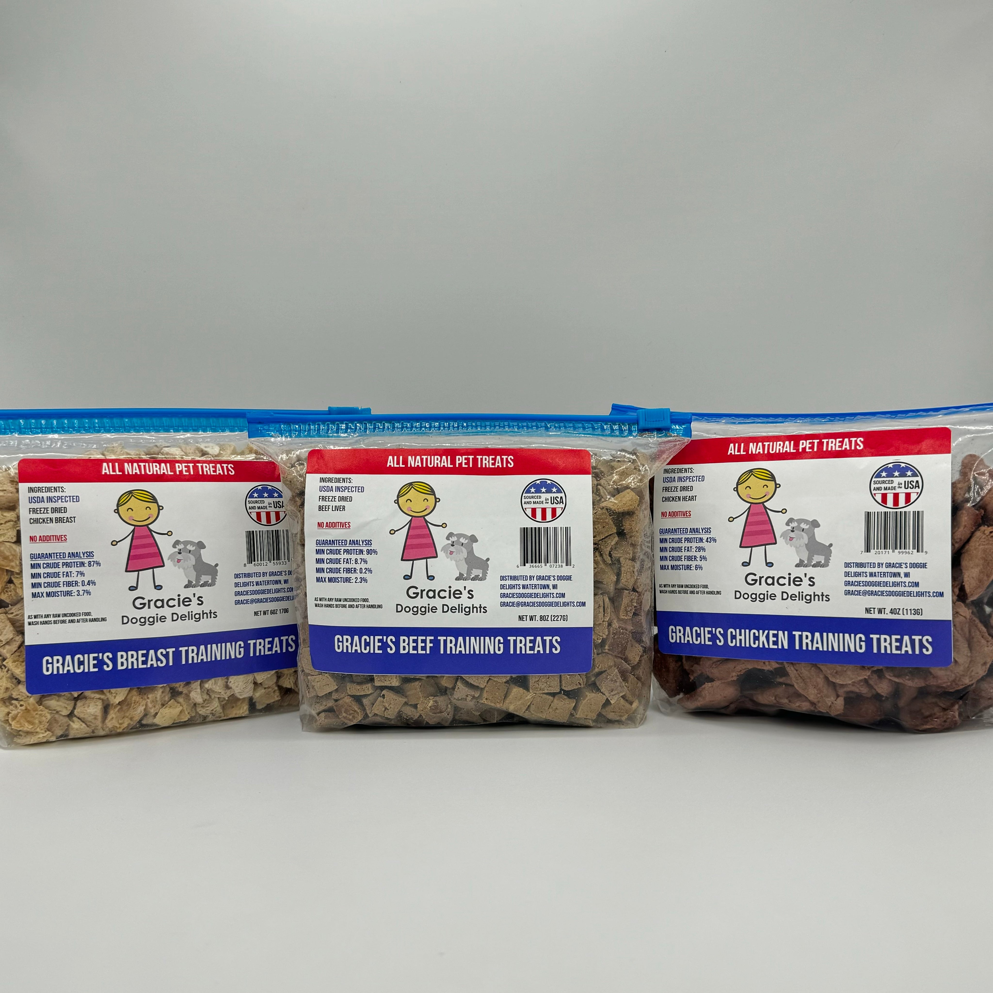 As with all our treats, Gracie's Training treats are made with one ingredient, Freeze Dried USDA Inspected Meat and are freeze dried raw with no additives. The slow freeze drying process locks in the delicious flavor that pets crave with no grains, gluten, chemicals or preservatives. It's a raw food treat without the mess. They're the treats pets love and you'll love giving.