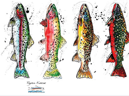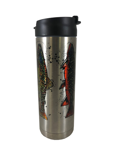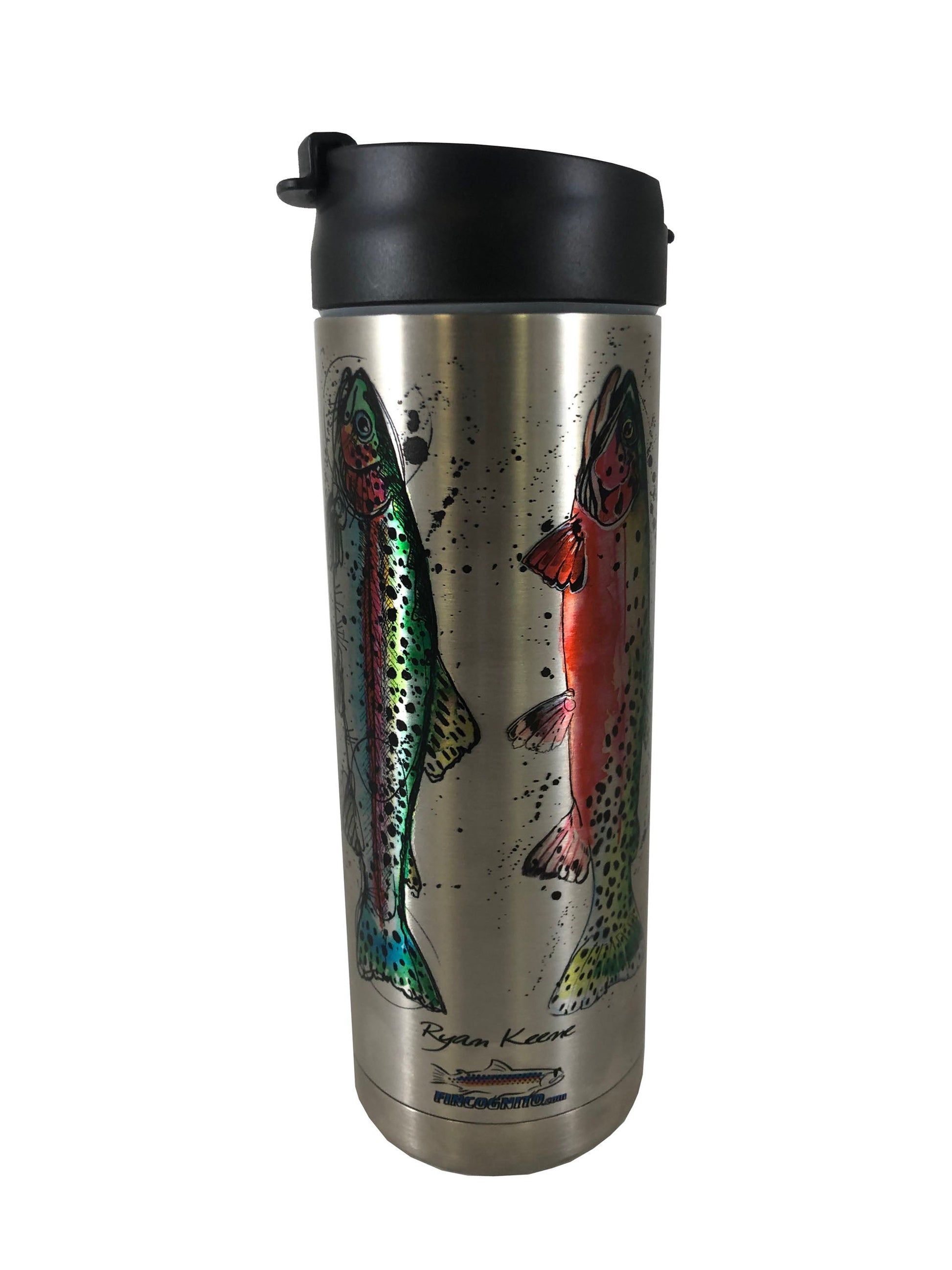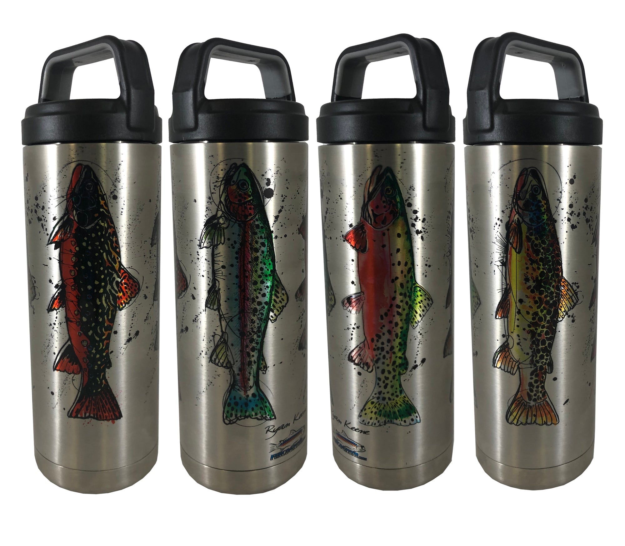 Our 20 oz. double walled bottle will keep your cold beverages icy cold and your hot beverages steaming for hours. Shipped with a screw off water bottle top and a flip top coffee lid, youβre set for the drive to the put-in or all day in the boat. Featuring stunning artwork from Ryan Keene, we present the grand slam of trout fishing...rainbow trout, western cutthroat, brown trout and brook trout. Stainless bottle.