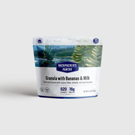 This artisanal, small-batch granola breakfast is a staff favorite. Our sweet and nutty granola is made locally using slivered almonds, coconut flakes, brown sugar, and rolled oats. We added sweet bananas and whole milk to bring you this hearty and wildly tasty freeze-dried camping breakfast. This is outdoor cuisine as it should be.