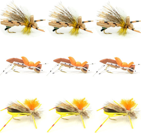 Grasshopper Trout Flies Fishing Flies Assortment Dropper Hopper Foam Body - 9 Flies 3 Patterns Hook Size 10