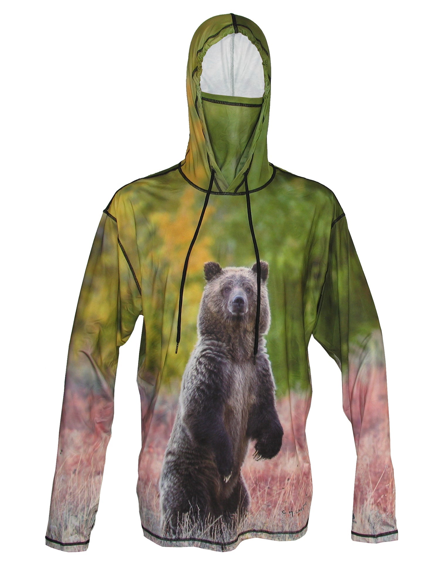 Our Mountaincognito wildlife animal graphic hoodie series includes "Griz" which shows a beautiful fall Grizzly bear in Yellowstone National Park. Photographic picture hoodie art by Charlie Lansche. The sun protective UPF50 Sunpro Hoodie features a lightweight (150gr.) 4-way stretch fabric (85% polyester 15% Spandex) for comfort and fit unmatched. An internal neck gaiter built into the hood is included for free. Great sun protection, moisture wicking apparel.