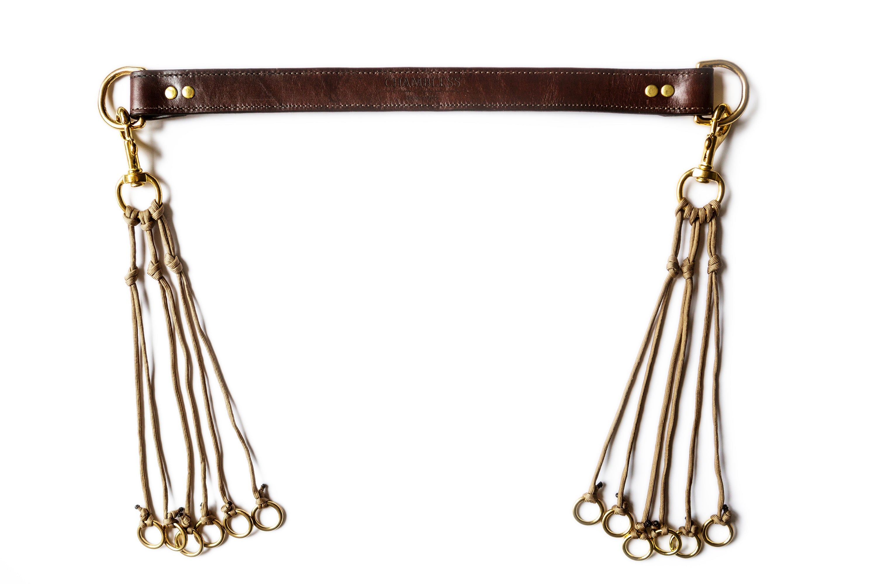 Transport your ducks and geese out in Style with this timeless stitched English Bridle Leather Tote, designed to go over the shoulder or around neck. This Tote comes with a comfortable 1.50-inch English Bridle Leather Strap and 12 drops made of 550 Military Grade parachute cord, each with a solid brass cinch ring. The 12 drops are detachable with a solid brass connector for easy removal from strap for storage. This Tote was designed to avoid making return trips when bringing game from the blind.
