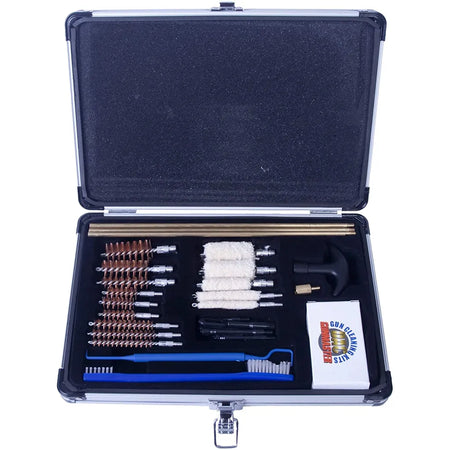 This universal cleaning kit from Gunmaster includes a variety of components for cleaning firearms .22 caliber and larger. Includes one set of solid brass rods, one universal handle, nine bore brushes, five cotton mops, one accessory adapter, three plastic slot tips for patches, 5 jags, one double-ended utility brush, one double-ended cleaning pick, and one box of 50 cleaning patches.