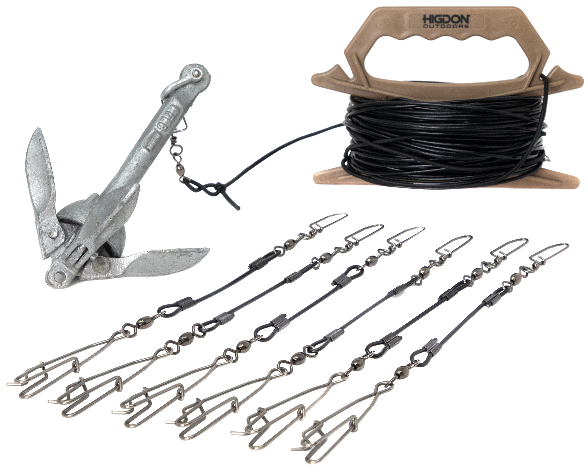 The Higdon Outdoors Battleship Jerk Rig is a simple and convenient way to add tons of movement and water disturbance to floating decoys spread without any batteries or wires. Higdon's rust-free quick-connect decoy clips attach to this 125 foot PVC coated steel cable, creating natural swimming, feeding and bobbing motion when pulled. Includes a poly handle, 1.5 lb. Grapnel Anchor, Six Quick-connect decoy clips, 5 ft. of tangle resistant marine bungie, and carry pouch. Quick-Connect decoy clips make it easy to customize decoy placement.