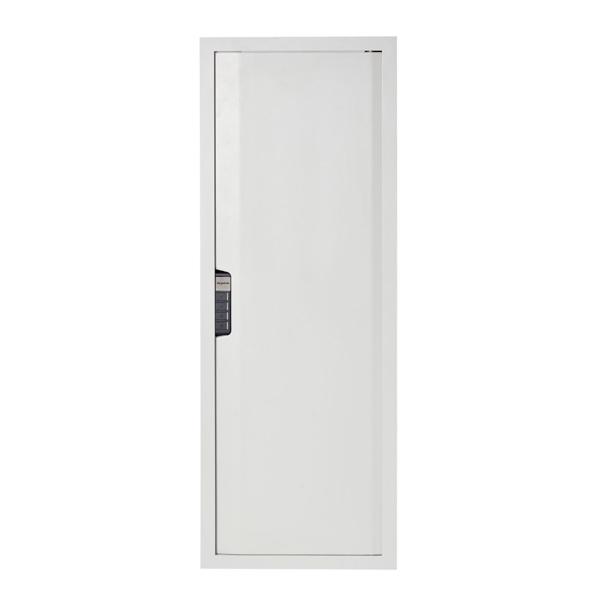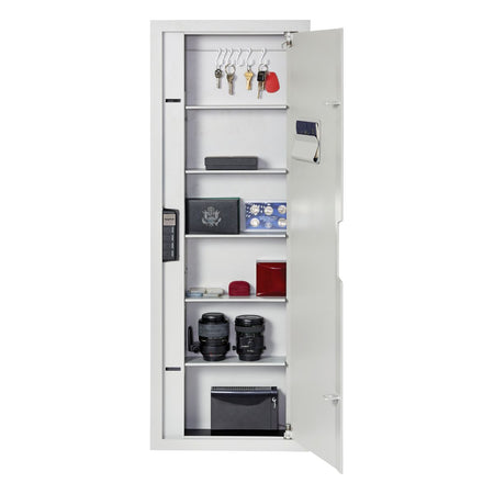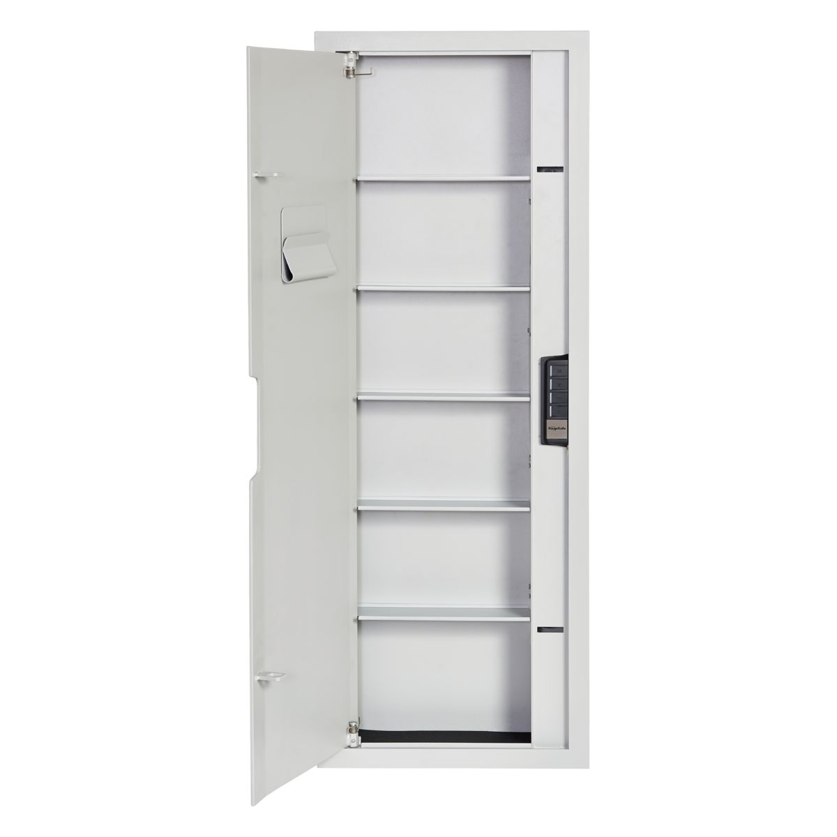 Innovative latch mechanism maximizes useable interior space. 16 gauge steel body construction and 8 gauge steel door. Electronic lock with key backup. Light Gray durable powder coated finish. Ability to orient as left or right opening. Removeable storage shelves. Audio and LED visual warning light when battery is running low. Magnetic jewelry/key hooks. Magnetic document holder. Spring Assist Door. 4 AA Batteries (Not Included)