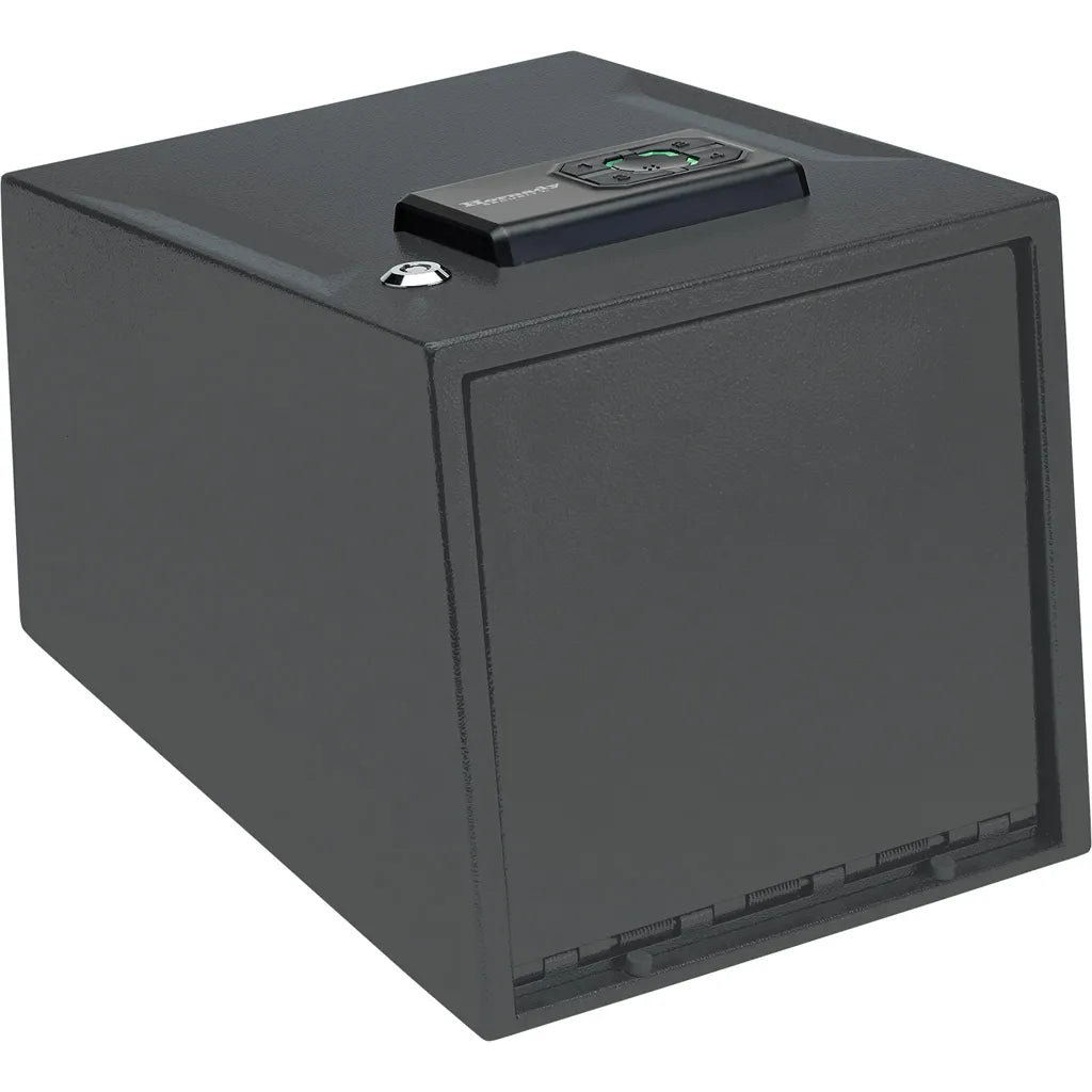 This Two-Gun Keypad Vault has a removable shelf to provide twice the storage space while it sits on a desk or nightstand. Secured by a programmable 4 to 6 digit code and 16-gauge steel. Protective foam lines the interior to protect from scratches or marring. A spring-loaded door opens to reveal the illuminated interior. Selectable audio and visual low-battery indicators remind you when to change the four AAA batteries (not included), a backup barrel key is included. This box fits 1911-size pistol and 4-inch revolvers. Exterior dimensions are 12.7? x 9? x 8.8?. Interior dimensions are 11.4? x 8.6? x 6.3?.
