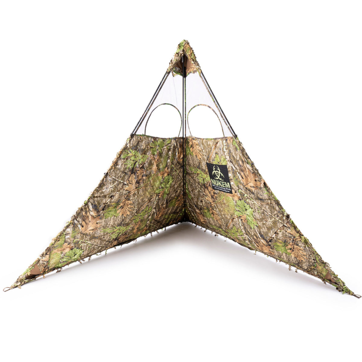 Nukem Grab & Go Hunting Blind, a versatile and lightweight ground blind designed for hunters who prefer mobility and convenience. This blind features a 3D leafy Mossy Oak Obsession camo pattern, providing optimal concealment with the camo pattern on the front and back.
