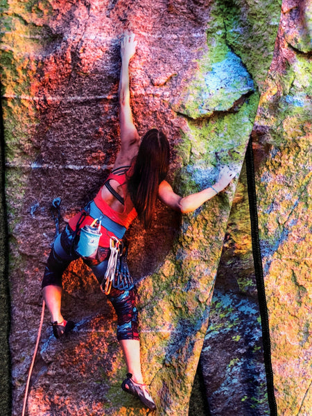 An incredible climbing image on a performance yoga-style legging. We make the best women's outdoor hiking and climbing clothing available. Wear as wader liners, long underwear, workout leggings, or for a night on the town. Our outdoor apparel works well as hiking clothes on the trail or as a base layer for active sports. Moisture wicking apparel with great sun protection.