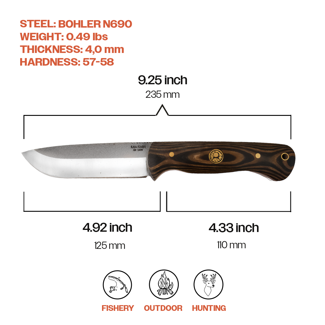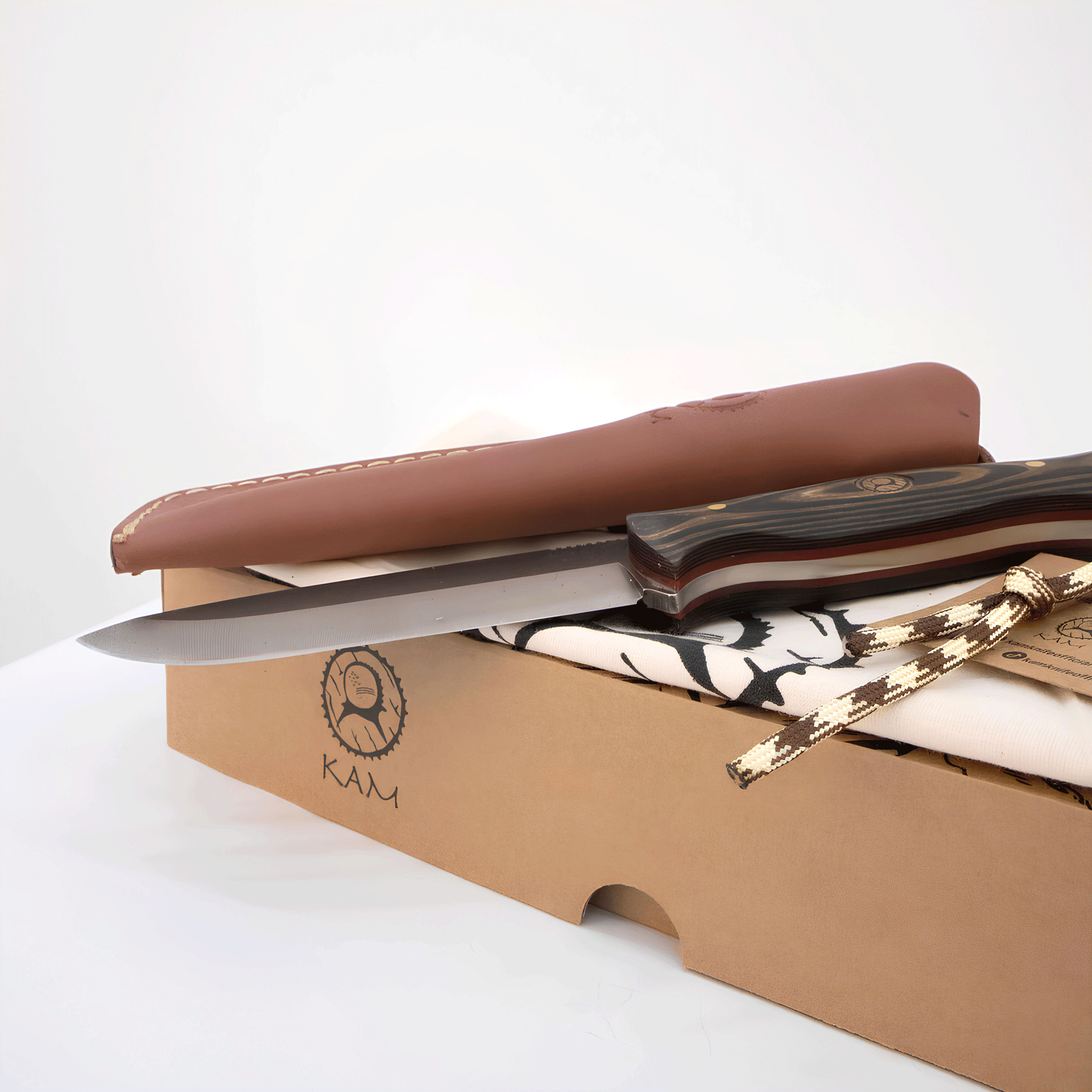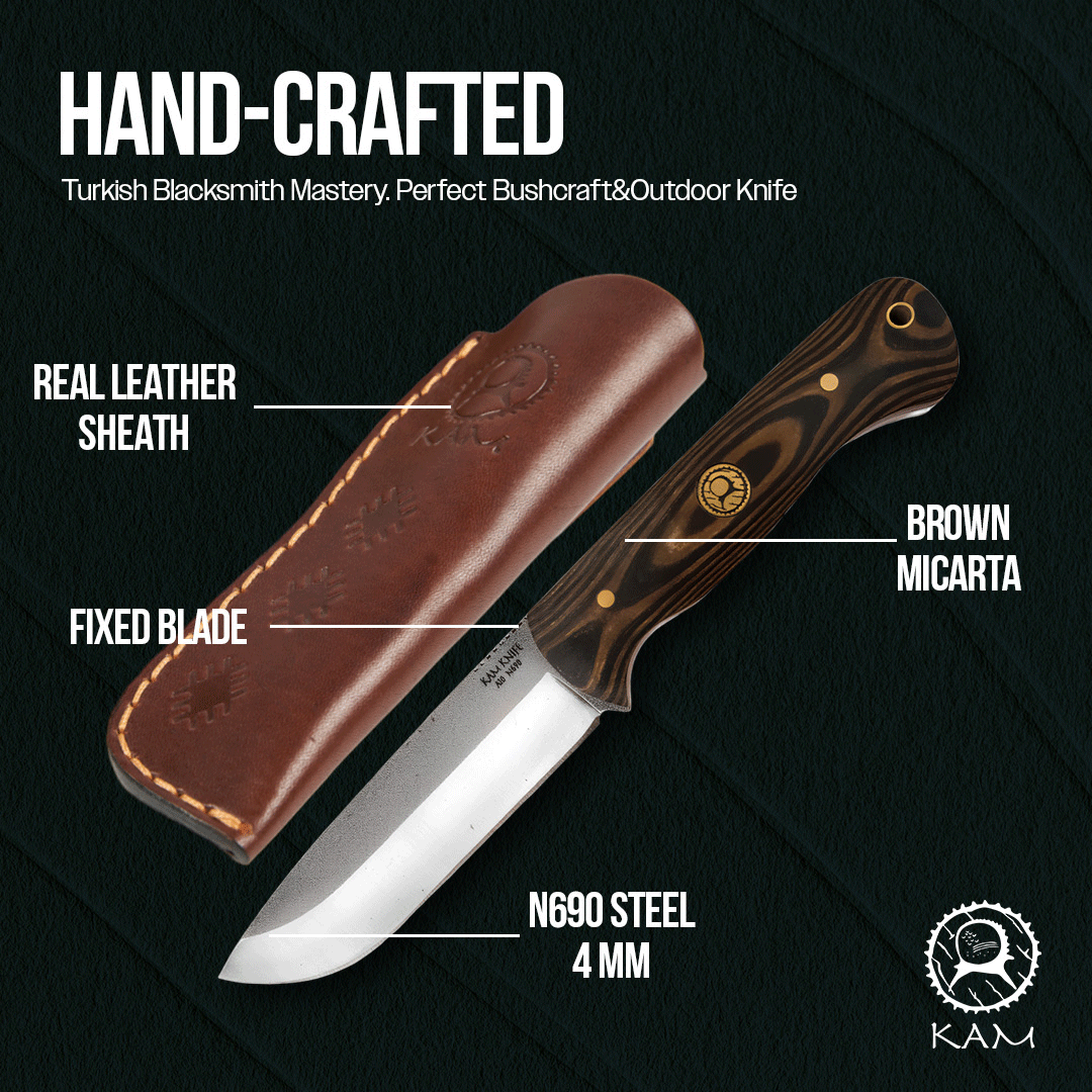 | Specifications: Size: 4.92" Blade Material: N690 Stainless Steel Handle Material: G-Micarta Blade Thickness: 4mm Made in Türkiye Note: The product cover sent may vary depending on the supply and production process. Explore the wilderness and camp out carrying your favorite knives. The Kam outdoor knife was created so that there will be no need to carry a heavy knife when backpacking. The Kam knife is aesthetic and is sought out by enthusiasts thanks to the micarta handle. It is pleasing to look at compared to other EDC knives. The excellent craftsmanship and durable designs allow it for outdoor activities. Besides the outdoor activities, the Kam knife boasts versatility that extends to a wide range of daily tasks. Its ergonomic design ensures a comfortable grip, setting it apart from other knives. The carefully crafted handle fits seamlessly into your hand, promoting precision and control during use. Whether you're slicing through tree branches packages, ropes, or tackling any outdoor projects, the Kam knife remains a reliable companion. Makes a perfect gift for people who like to do outdoor activities. The Kam knife is a practical tool that embody the spirit of self-reliance and adventure. |