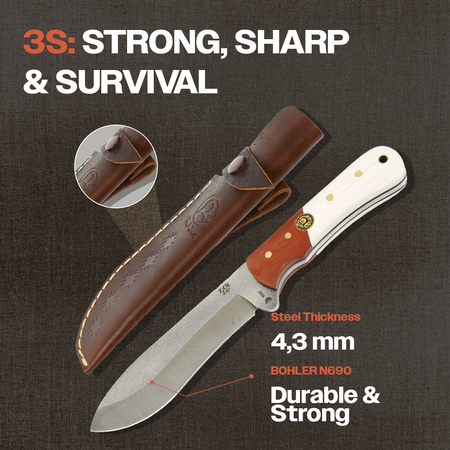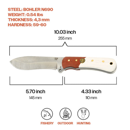 | Specifications: Size: 10.03" Blade Material: BÖHLER N690 Stainless Steel Handle Material: Wood Blade Thickness: 4.3 mm Made in Türkiye Explore the wilderness and camp out carrying your favorite knives. The Kam outdoor knife was created so that there will be no need to carry a heavy knife when backpacking. The Kam knife is aesthetic and is sought out by enthusiasts thanks to the micarta handle. It is pleasing to look at compared to other EDC knives. The excellent craftsmanship and durable designs allow it for outdoor activities. Besides the outdoor activities, the Kam knife boasts versatility that extends to a wide range of daily tasks. Its ergonomic design ensures a comfortable grip, setting it apart from other knives. The carefully crafted handle fits seamlessly into your hand, promoting precision and control during use. Whether you're slicing through tree branches packages, ropes, or tackling any outdoor projects, the Kam knife remains a reliable companion. Makes a perfect gift for people who like to do outdoor activities. The Kam knife is a practical tool that embody the spirit of self-reliance and adventure. |