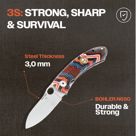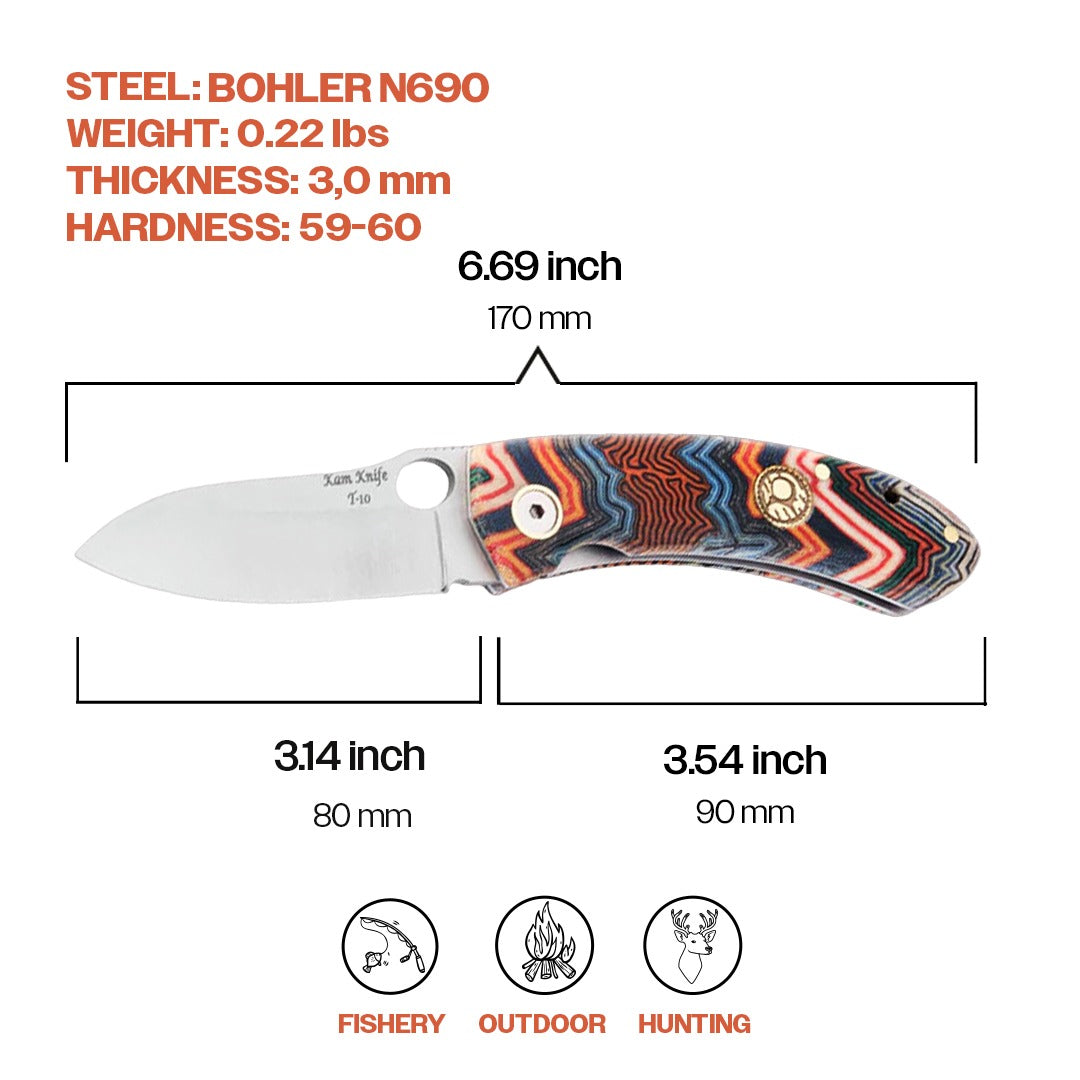 Specifications: Size: 6.69" Blade Material: BOHLER N690 Stainless Steel Handle Material: G-Micarta Blade Thickness: 3 mm