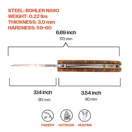 Specifications: Size: 6.69" Blade Material: BÖHLER N690 Stainless Steel Handle Material: Micarta Wood Blade Thickness: 3mm