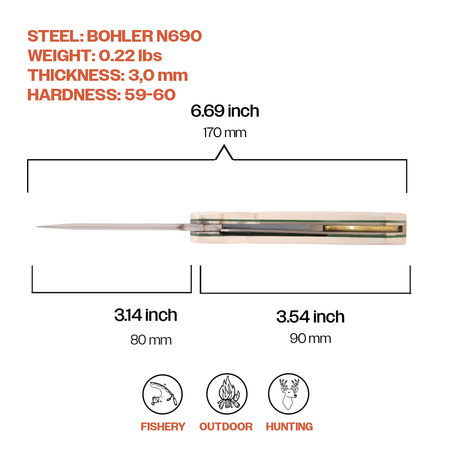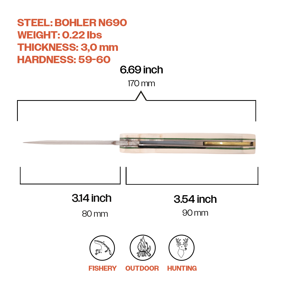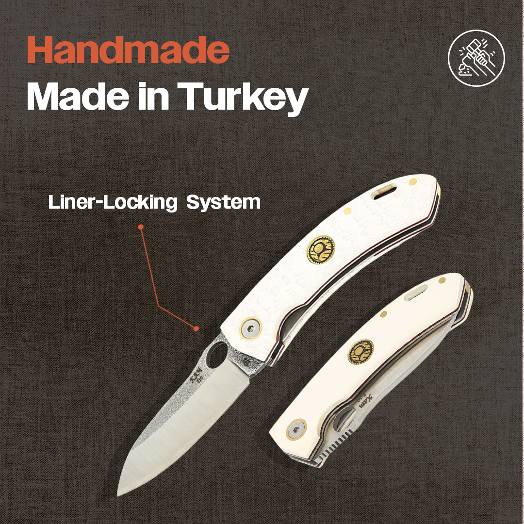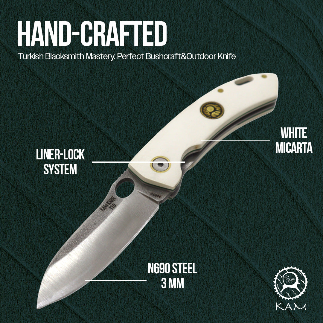 | Specifications: Size: 6.69" Blade Material: BÖHLER N690 Stainless Steel Handle Material: Micarta Blade Thickness: 3mm Made in Türkiye Note: The product cover sent may vary depending on the supply and production process.Explore the wilderness and camp out carrying your favorite pocket knifes. The Kam outdoor knife was created so that there will be no need to carry a heavy knife with a fixed blade when backpacking. The Kam knife is aesthetic and is sought out by enthusiasts thanks to the micarta handle. It is pleasing to look at compared to other EDC knives. Our high quality sharp pocket knife comes with a locking mechanism which hides and holds the blade in place when not in use. The excellent craftsmanship and durable designs allow it for everyday outdoor use such as going on hiking adventures, hunting, fishing and many more outdoor activities. Besides the outdoor activities, the Kam knife boasts versatility that extends to a wide range of daily tasks. Its ergonomic design ensures a comfortable grip, setting it apart from other folding knives. The carefully crafted handle fits seamlessly into your hand, promoting precision and control during use. Whether you're slicing through tree branches packages, ropes, or tackling any outdoor projects, the Kam knife remains a reliable companion. Makes a perfect gift for people who like to do outdoor survival activities. The Kam knife is a practical tool that embody the spirit of self-reliance and adventure. Their compact size belies their impressive capabilities. In the realm of outdoor gear, small pocket knives stand out as timeless and indispensable tools for those who relish the thrill of the great outdoors." |