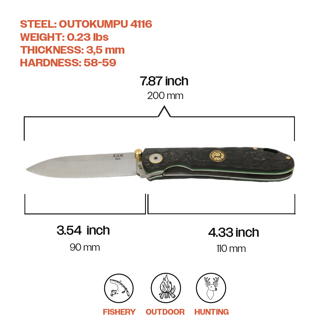 Specifications: Size: 7.87" Blade Material: OUTOKUMPU 4116 Stainless Steel Handle Material: Micarta Blade Thickness: 3.5mm