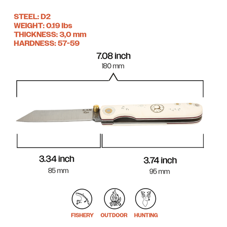 | Specifications: Size: 7.08 Blade Material: D2 Steel Handle Material: Micarta Blade Thickness: 3mm Made in Türkiye Note: The product cover sent may vary depending on the supply and production process. Explore the wilderness and camp out, carrying your favorite pocket knives. The Kam outdoor knife was created so that there will be no need to carry a heavy knife with a fixed blade when backpacking. The Kam knife is aesthetic and is sought out by enthusiasts thanks to the D2 blade. It is pleasing to look at compared to other EDC knives. The excellent craftsmanship and durable designs allow it for outdoor activities. Besides the outdoor activities, the Kam knife boasts versatility that extends to a wide range of daily tasks. Its ergonomic design ensures a comfortable grip, setting it apart from other knives. The carefully crafted handle fits seamlessly into your hand, promoting precision and control during use. Whether you're slicing through tree branches packages, ropes, or tackling any outdoor projects, the Kam knife remains a reliable companion. Makes a perfect gift for people who like to do outdoor activities. The Kam knife is a practical tool that embody the spirit of self-reliance and adventure. |