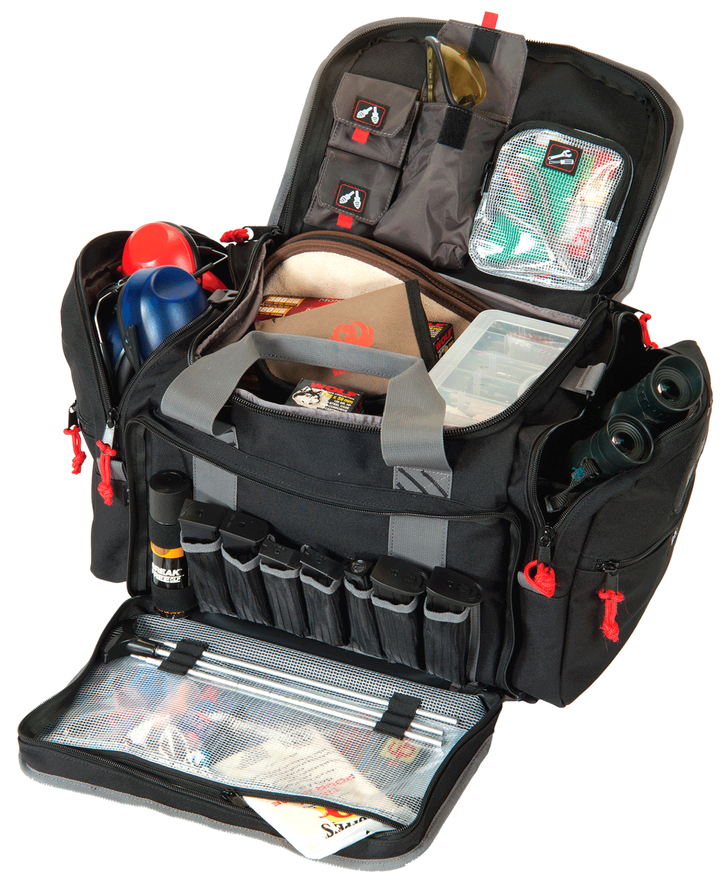 This magnum sized bag is designed to carry multiple handguns plus ammo for all. The long gun shooter will also appreciate the large u-shape top opening for ease of securing ammo. Both side pockets drop down for added protection for weapons and the backside drop pocket features a hook and loop backing for securing multiple ammo dump cups, for sorting bulk ammo or for saving brass casings for reloading. This large bag has every available visual i. D. Storage system pocket. Lift ports have been added for easy maneuverability and metal hardware on the shoulder strap for durable hands-free transportation. Large loop zipper pulls allow for a lock to be added to secure all areas for legal transport.