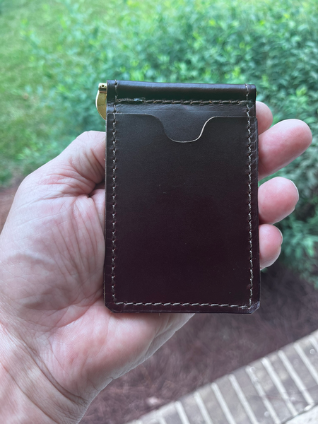 This English bridle leather money clip / cardholder is a sleek and minimalist option for those who prefer to carry essentials without the bulk of a traditional wallet. Made of English bridle leather combined with a soft pigskin liner to give it a refined, sturdy exterior with a comfortable, supple interior. This design is perfect for organizing cards and cash while being lightweight enough to avoid discomfort—especially for those who don't like carrying bulky wallets in their pockets. A stylish, durable option!