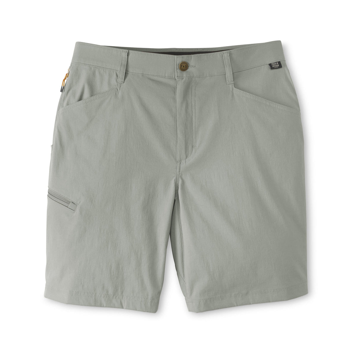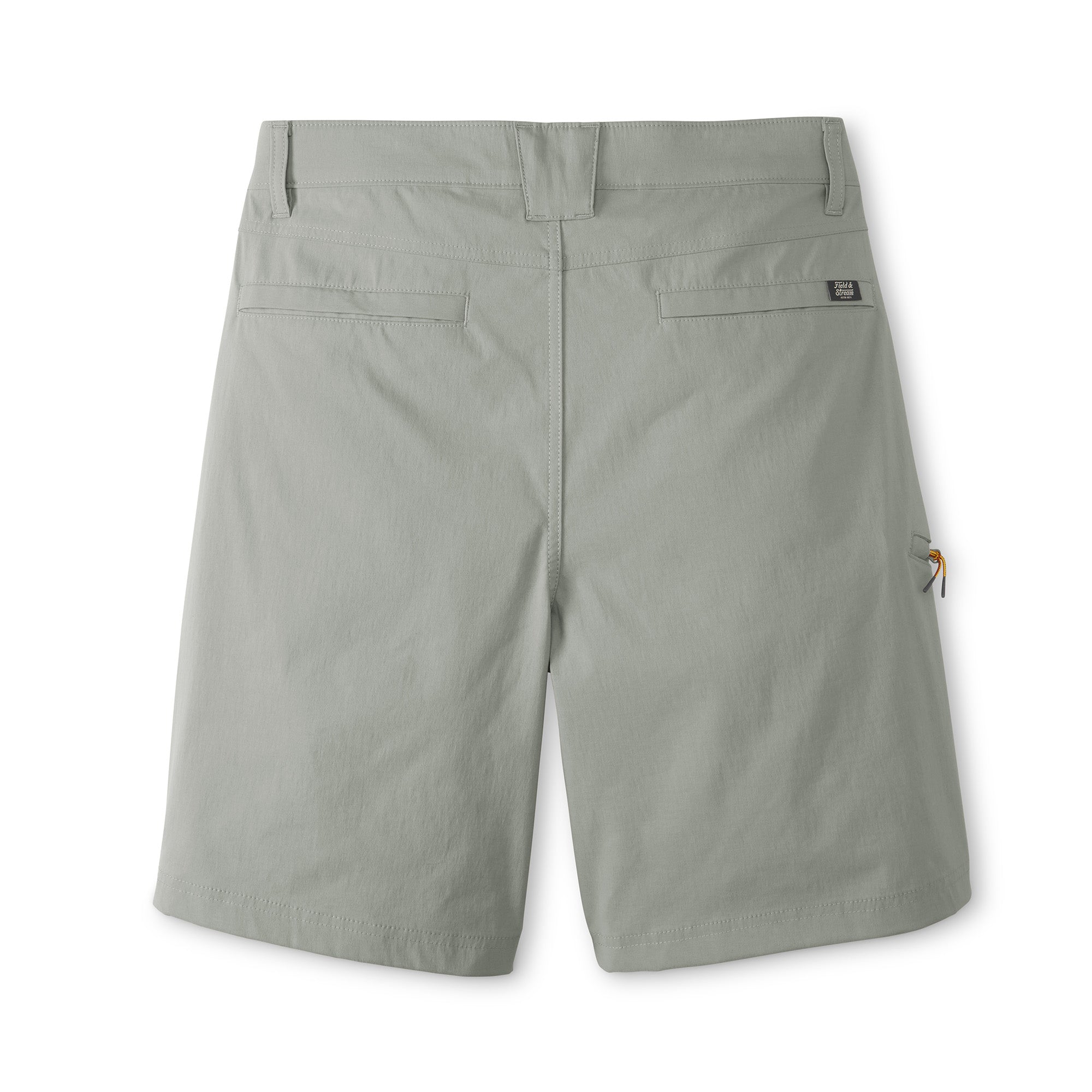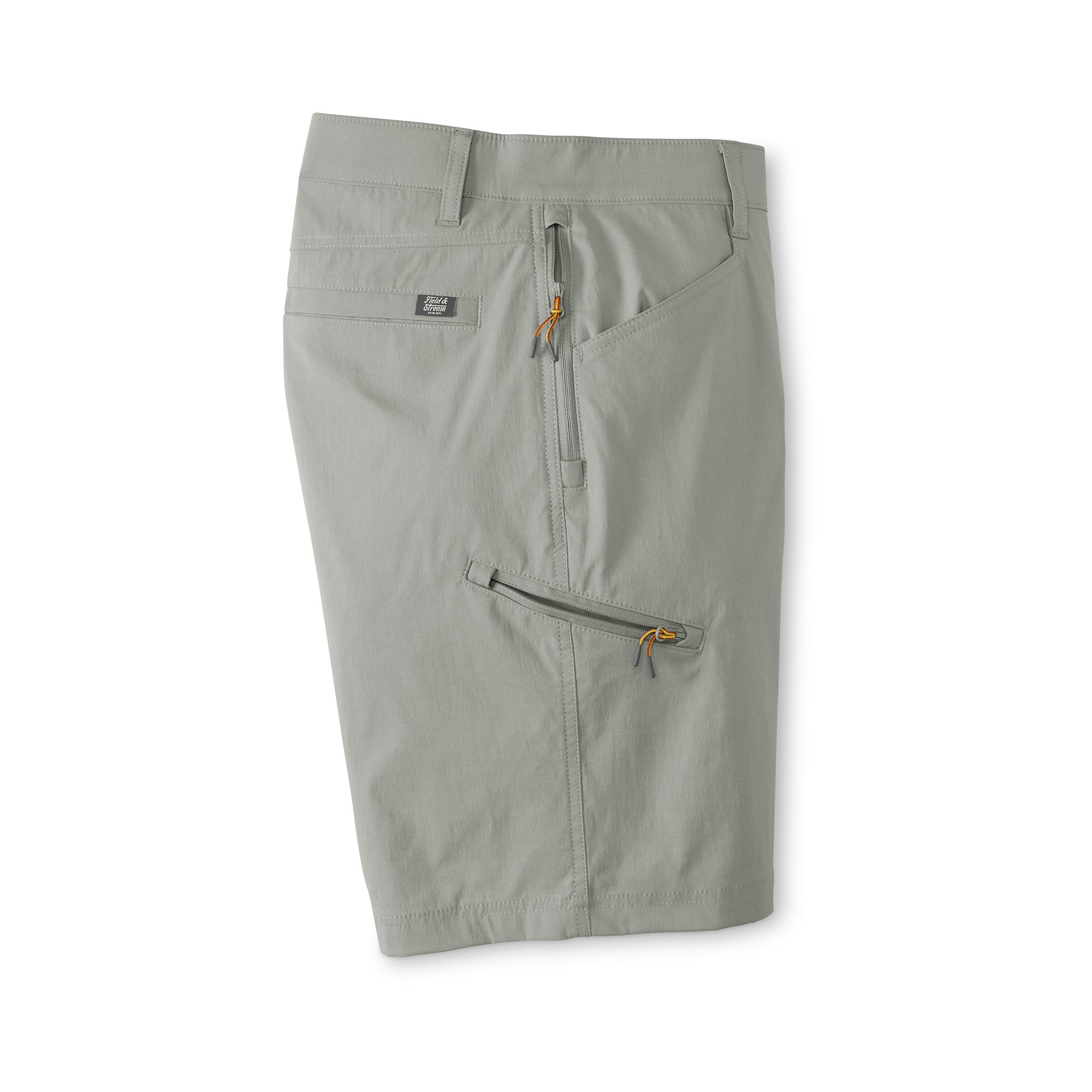 Our flat front Performance Fishing Shorts are ready to tackle hard tasks in any body of water, they have an ideal fit and give you freedom to move. Made exclusively for Field & Stream in stretch woven 95% nylon, 5% spandex – nylon for extra durability and reduced shrinkage, Spandex for added stretch and recovery. 5.3 oz. C0 finish to repel water and water-based stains. Lots of features: double-needle stitches, two top front pockets, zippered thigh pocket on wearer’s right side, hidden zipper pocket behind right hip pocket for cell phone - 7 inches deep, rear envelope pockets to secure goods and ease of entry, two grommets in pockets for water or sand to leak through, reinforced pocket bottoms – sewn over for longer durability. Elastic waistband and gusset at crotch for extra moveability and stretch. Field & Stream branded. 9-inch inseam.