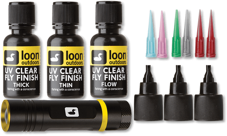 With everything a tyer needs to make the move from Classic cements to UV Cure, the UV Fly Tying Kit includes UV Clear Fly Finish Thick, Thin and the brand new, ultra-thin Flow, and a UV Bench Light.