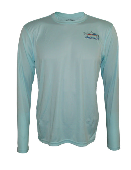 Lightweight sun protective SPF 50 fishing shirts. We place Vaughn Cochran's "Lean Mean Fighting Machine" on the back of this seagrass green-colored long sleeve T. The Fincognito logo adorns the left chest. 100% polyester with PURE-Tech wicking technology. Our fly fishing apparel works well on the water or as hiking clothes on the trail. Great sun protection, moisture wicking apparel.