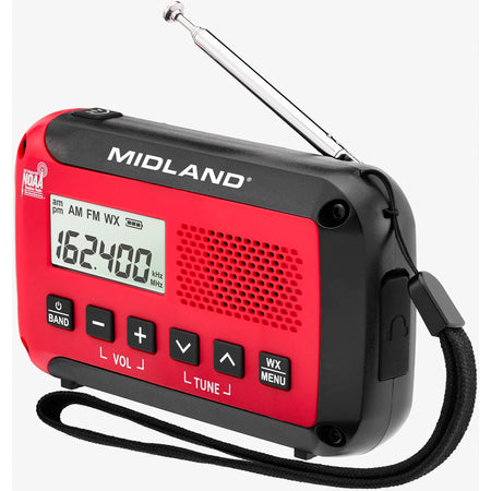 The Midland Emergency Radio with AM/FM and Weather Alert keeps you informed and prepared in any situation. This compact, reliable device receives emergency and weather alerts directly from the National Weather Service, ensuring you stay updated before, during, and after storms or emergencies. Featuring a built-in flashlight with high/low beams and an SOS strobe, an AM/FM radio with a digital clock, and a wrist lanyard for portability, itβs designed for convenience and safety. Powered by 3 included AA batteries, the compact ER10VP is your go-to emergency companion.