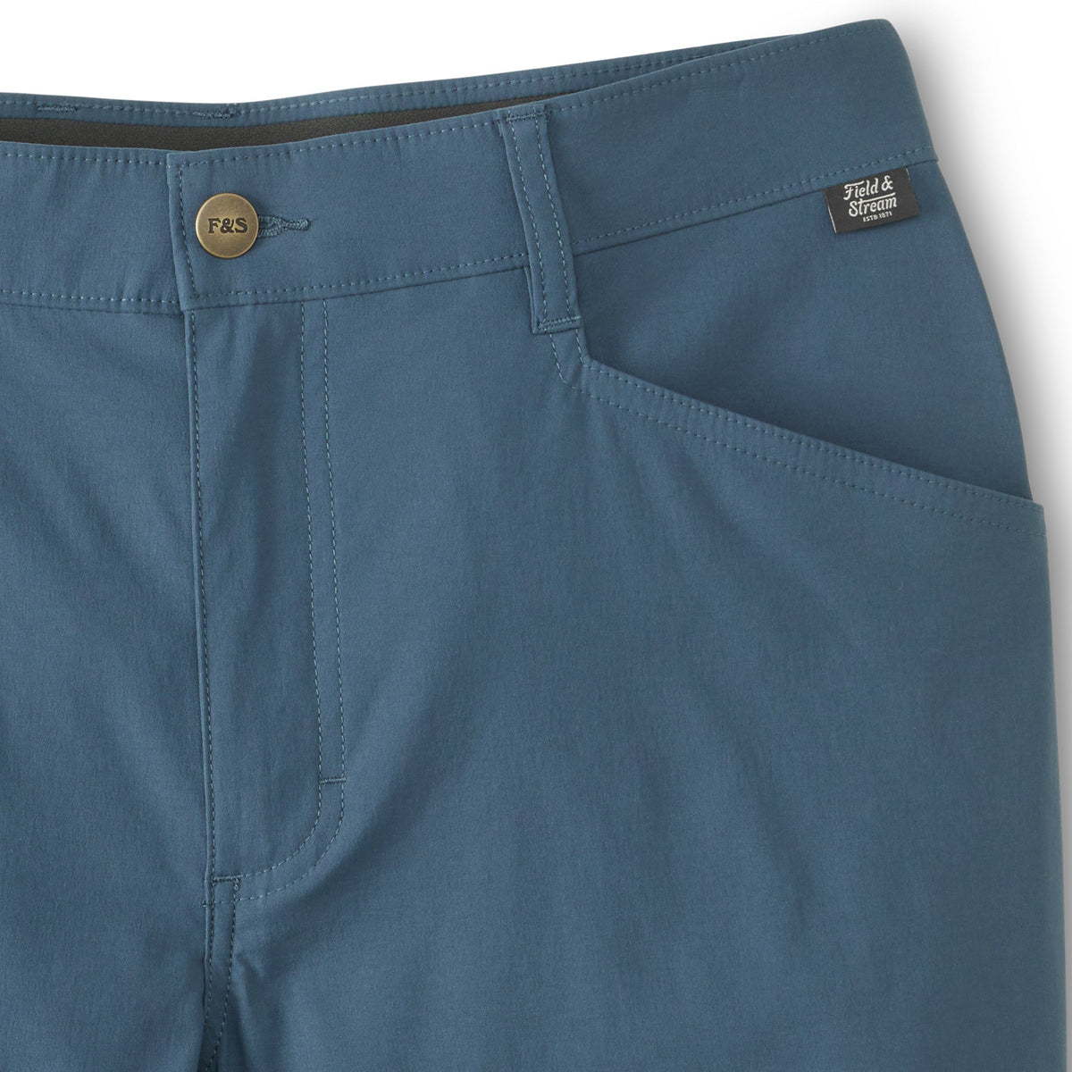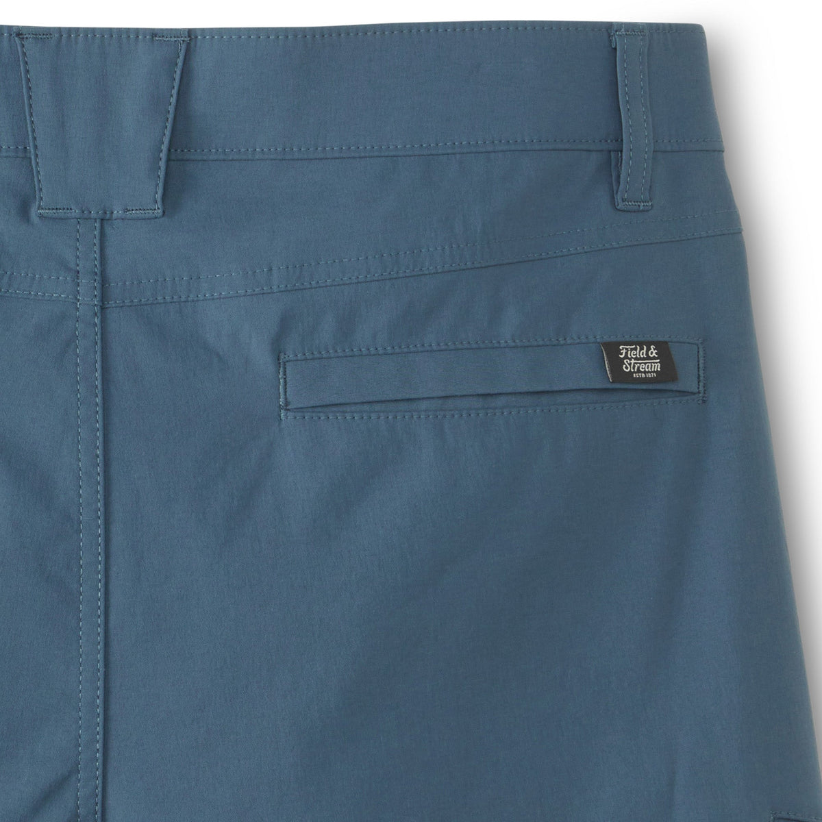 Our flat front Performance Fishing Shorts are ready to tackle hard tasks in any body of water, they have an ideal fit and give you freedom to move. Made exclusively for Field & Stream in stretch woven 95% nylon, 5% spandex – nylon for extra durability and reduced shrinkage, Spandex for added stretch and recovery. 5.3 oz. C0 finish to repel water and water-based stains. Lots of features: double-needle stitches, two top front pockets, zippered thigh pocket on wearer’s right side, hidden zipper pocket behind right hip pocket for cell phone - 7 inches deep, rear envelope pockets to secure goods and ease of entry, two grommets in pockets for water or sand to leak through, reinforced pocket bottoms – sewn over for longer durability. Elastic waistband and gusset at crotch for extra moveability and stretch. Field & Stream branded. 9-inch inseam.