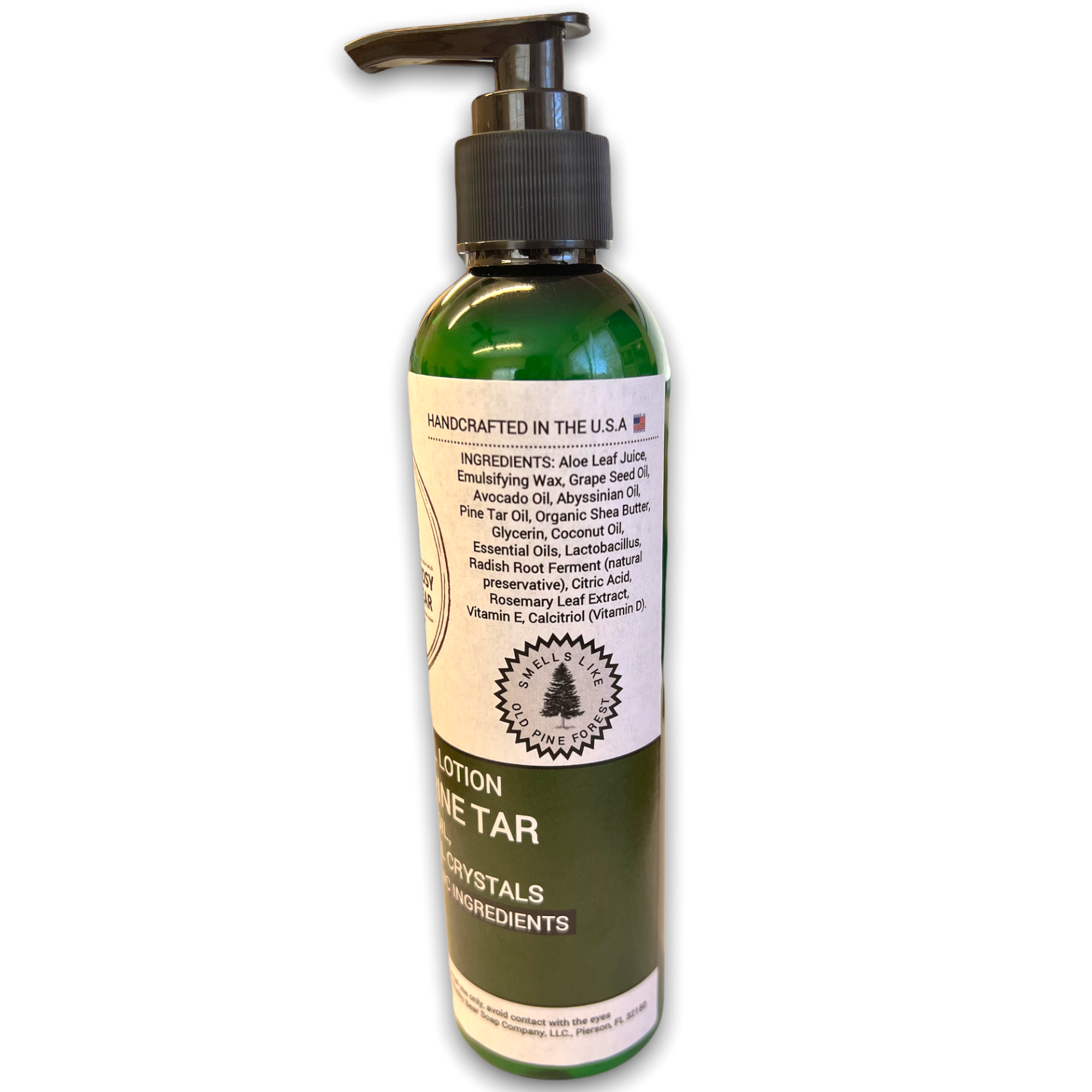 Woodsy, Robust & Forest Fresh. We've formulated this Old Forest Pine Tar Lotion specifically for men that will leave your skin moisturized, revitalized, smooth and smelling wilderness-fresh! We've added chilly Menthol Crystals to the newest batches to take the relaxation level through the roof! Excellent to pair with our Old Forest Pine Tar soap, shampoo bar and organic beard oil! Just suds up in the shower and use the lotion as needed for your face and body afterwards to get the full-forest effect! As a bonus, you'll feel and smell like a manlier, more robust and vigorous you! We use All Natural Radish Root preservative, soothing Rosemary Leaf Extract, Rich Aloe Leaf Juice, Grape Seed and Avocado Oils that soothes, nourishes and replenishes the skin. We added rejuvenating Abyssinian Oil, which is full of excellent moisturizing and anti-aging properties. Designed to deeply moisturize without leaving a residue and absorbing into skin. You'll smell Fresher than the Lumber Aisle at your local Home Improvement Store, we guarantee it!