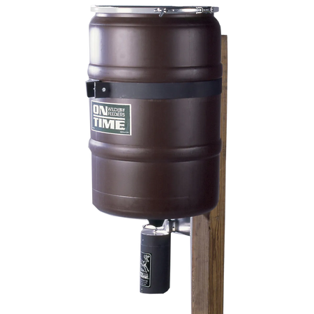 On time's elite fish feeder combo comes with 25 gallon capacity hopper, a steel attachment band with welded brackets for mounting to 4x4 dock post (post not included).It features a built in agitator rod that keeps feed flowing.Comes with elite lifetime feeder and elite fish feeder with a deflector plate which allows for directional feeding.