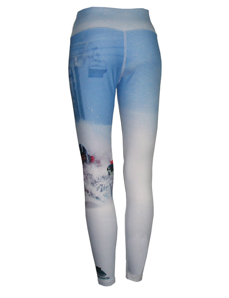 Pow 2 shows a deep powder skier on a performance yoga-style legging. We make the best women's outdoor skiing hiking and climbing clothing available. Wear as wader liners, long underwear, workout leggings, or for a night on the town. Our outdoor apparel works well as hiking clothes on the trail or as a base layer for active sports. Moisture wicking apparel with great sun protection. ORDER NOW FOR AN EXPECTED SHIP DATE: JUNE 1, 2025.