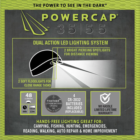- Dependable: The POWERCAP® beanie provides reliable lighting use after use without dimming or flickering. Each LED lighting component has been tested to ensure its design is superior. Your POWERCAP® will give you approximately 68 hours of light life on one battery. That’s reliability you can bank on from dusk to dawn.