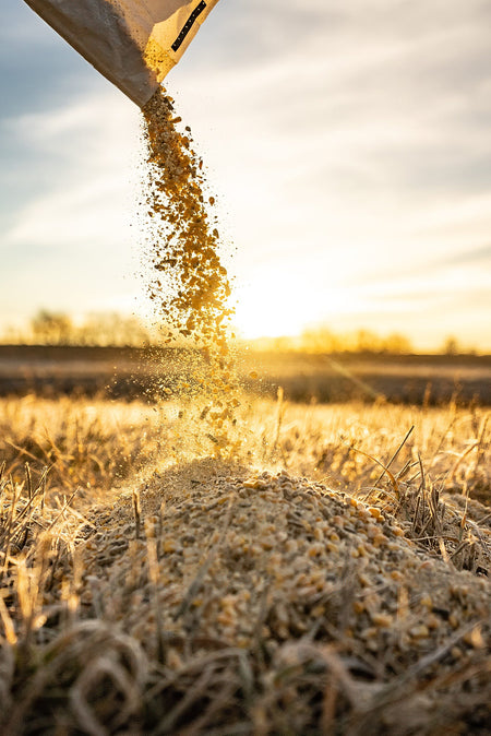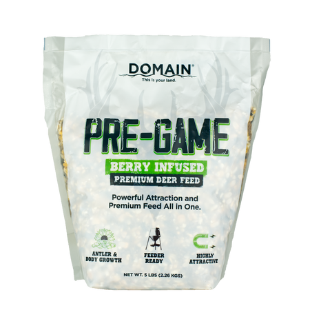 DOMAIN’S PRE-GAME PREMIUM DEER FEED IS A TEXTURED FEED DESIGNED TO ATTRACT AND FEED DEER ON A YEAR ROUND BASIS BY PROVIDING OPTIMAL LEVELS OF PROTEIN, ENERGY (FAT), VITAMINS AND MINERALS. IT IS A COMPLETE FEED PRODUCT THAT WILL AID IN IMMUNE SYSTEM SUPPORT, BODY GROWTH, ANTLER GROWTH AND OVERALL HEALTH OF YOUR HERD. PRE-GAME IS INFUSED WITH A SPECIAL NEWBERRY FLAVORING AND AROMA TO ENCOURAGE LONG RANGE ATTRACTION AND OFFER A FLAVOR PROFILE THAT WILL HAVE YOUR DEER BEGGING FOR MORE. PRE-GAME IS COMPRISED OF PROTEIN PELLETS, CORN, SUNFLOWER AND CRUSHED PLANT PROTEINS TO OFFER FLEXIBILITY IN HOW YOU FEED IT. IT CAN BE GROUND FED OR USED IN A VARIETY OF TROUGH OR GRAVITY STYLE FEEDERS. WITH IT’S RATIO OF PROTEIN TO ENERGY PRE-GAME WILL OFFER AN OPTIMAL FEED PRODUCT DURING GROWING SEASON TO HELP MAXIMIZE ANTLER GROWTH AND BE THE FOCUS OF ATTENTION WHEN WEATHER TURNS COLD IN THE FALL AND WINTER. PRE-GAME IS DESIGNED TO BE USED ON IT'S OWN BUT CAN ALSO BE ADDED TO CORN OR PROTEIN PELLETS AS A SUPPLEMENTAL FEED OFFERING.