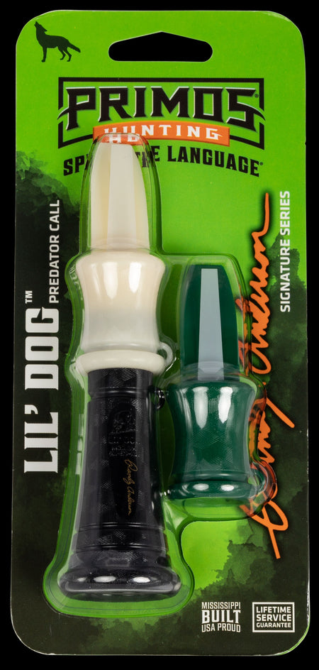 The primos lil' dog predator call features two mouthpieces, one white for long-range calling and one green for close-in calling.The lil dog is an open-reed style call that reproduces mouse peeps, distress calls of birds, jackrabbits, cottontails, fawns and pup whines.It is also a great pup howler.