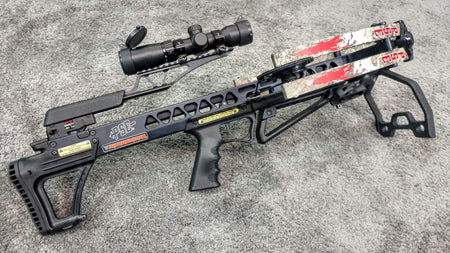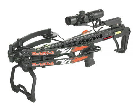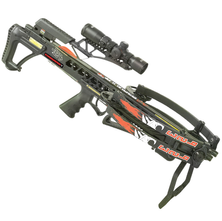 The Warhammer is a compact, powerful crossbow that delivers 400 FPS when firing a 400-grain bolt. This crossbow measures 29" long and 14.12" wide. Includes 3-22" Thunderbolt bolts, 3-100gr points, HDV 425 scope, quiver, rail lube, crossbow sling, cocking sled rope, and 1 discharge bolt.