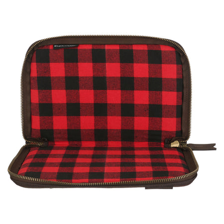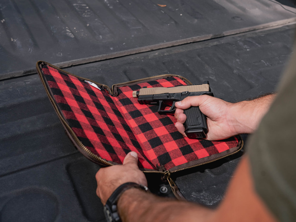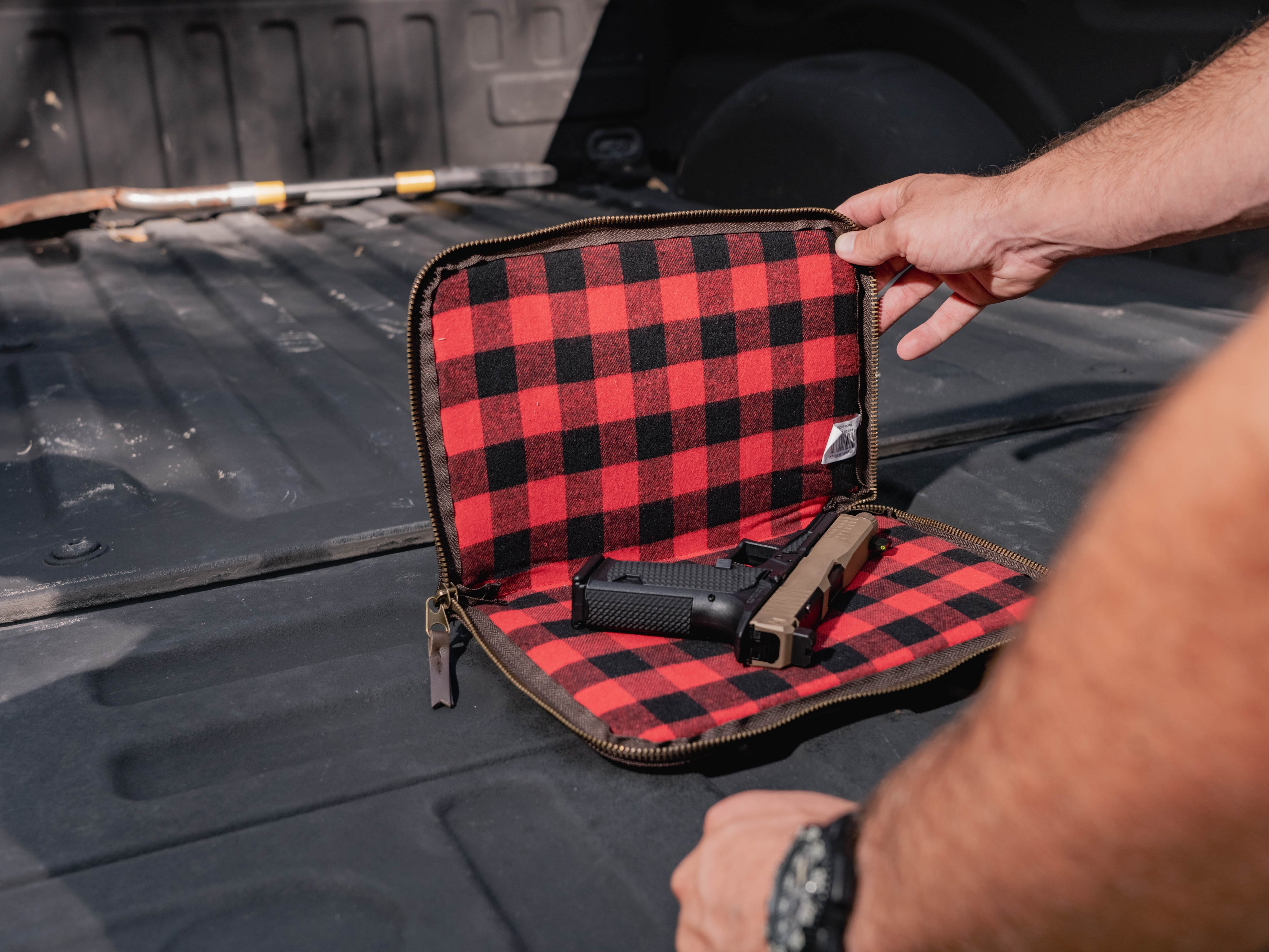 Featuring antique brass zippers and a leatherette logo patch, this case exudes a vintage charm that adds a touch of elegance to your gear. On the inside, the plaid flannel lining does a fantastic job of protecting your firearm's finish, shielding it from bothersome scratches and ensuring it stays looking like new. Plus, with the thick interior foam, your pistol remains snug and secure.