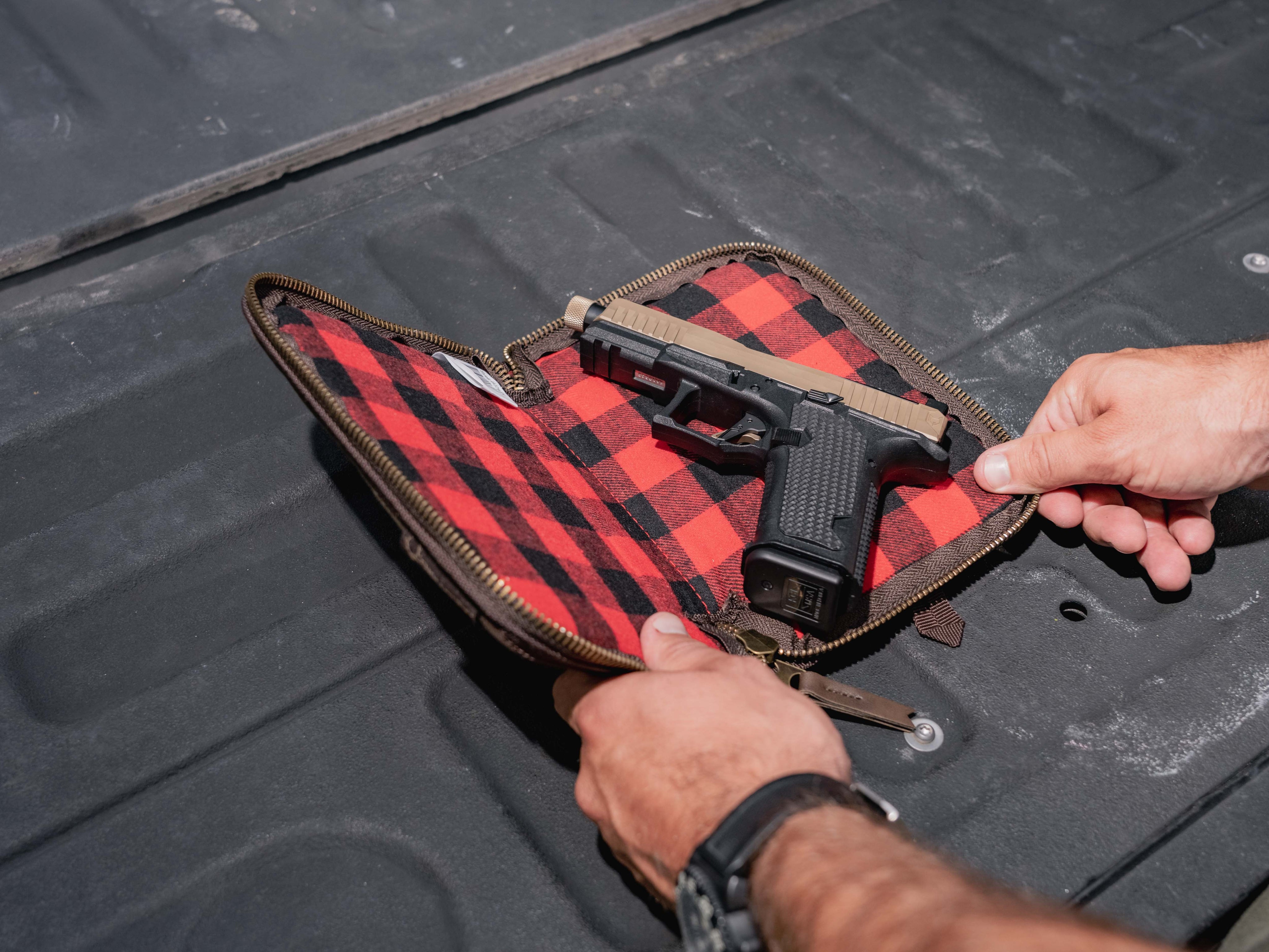 Featuring antique brass zippers and a leatherette logo patch, this case exudes a vintage charm that adds a touch of elegance to your hunting gear. On the inside, the plaid flannel lining does a fantastic job of protecting your firearm's finish, shielding it from bothersome scratches and ensuring it stays in top shape. Plus, with the heavy gauge interior foam padding, your pistol remains snug and secure, no matter how challenging the hunting trail gets.