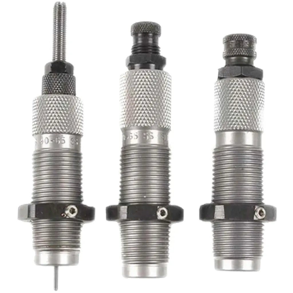 The 3-Die Roll Crimp Set is for loading straight-wall cartridges. The steel Sizer Die sizes the case and de-primes. Note: cases must be lubricated. The Expander Die expands the proper diameter to accept the bullet, and it imparts case mouth flare/bell for bullet feeding. The Seater Die seats the bullet and roll crimps.