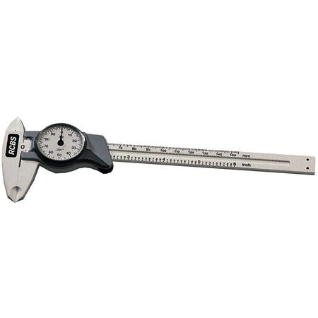 Fiberglass-reinforced super polymid construction. Range of 0-6'/0-150mm. Direct .001' readings. Graduations in .001' increments with 0.100' per single revolution of dial; 1.0mm bar scale. Friction thumb roller opens and closes caliper. Large black numbers and markings on white background. Fitted plastic storage case.