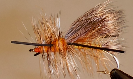 The Rubber Leg Stimulator is tied in a variety of colors, gold wire ribbing, floss head, and rubber legs. The peacock herl body gives the fly a well-defined profile, the gold wire ribbing adds flash, the floss head attracts fish, and the rubber legs give the fly additional movement.