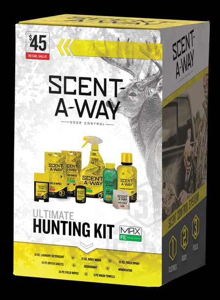 The Scent-A-Way MAX Odorless Ultimate Hunting Kit includes all the key items of each step all in one convenient box to make sure hunters are ready for the hunt. The Scent-A-Way MAX Odorless Ultimate Hunting Kit includes: 18oz Laundry Detergent Odorless; Dryer Sheets 15-pk Odorless; 12oz Body Wash/Shampoo; Antiperspirant; 32oz Field Spray Odorless; Field Wipes 24-pk; Wash Towels 3-pk and Windicator.
