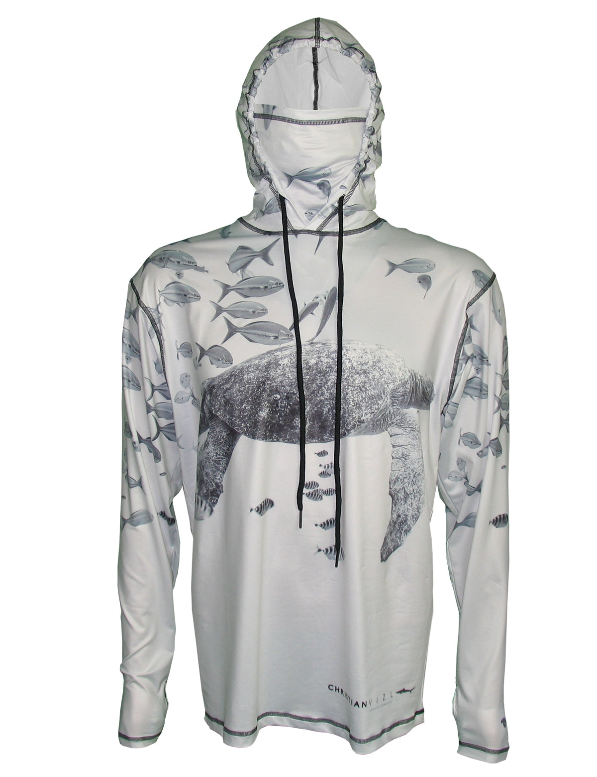 A Sea Turtle swims off the coast of Mexico in this Christian Vizl image. Our surf and dive beach apparel works great for sun protection on the ocean as well as hiking clothes on the trail or on the river. Great sun protection, moisture wicking apparel. An internal neck gaiter built into the hood is included for additional sun protection.