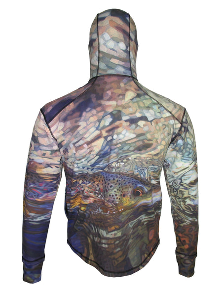 The heavyweight 1/4 Zip FlexShell is the top of the Fincognito fly fishing apparel and clothing line. Now with patented built-in facemask! It presents a wonderful AD Maddox's oil painting of a Brown Trout from her Secluded Waters series. The new 1/4-Zip FlexShell Graphic Fishing Hoodie also features thumb-hole cuffs, a zippered chest pocket, an articulated hood, two side-seam pockets, and flexible-shell fabric for comfort and fit unmatched. In a weather emergency, this wind-resistant hydro-phobic material will withstand the elements.
