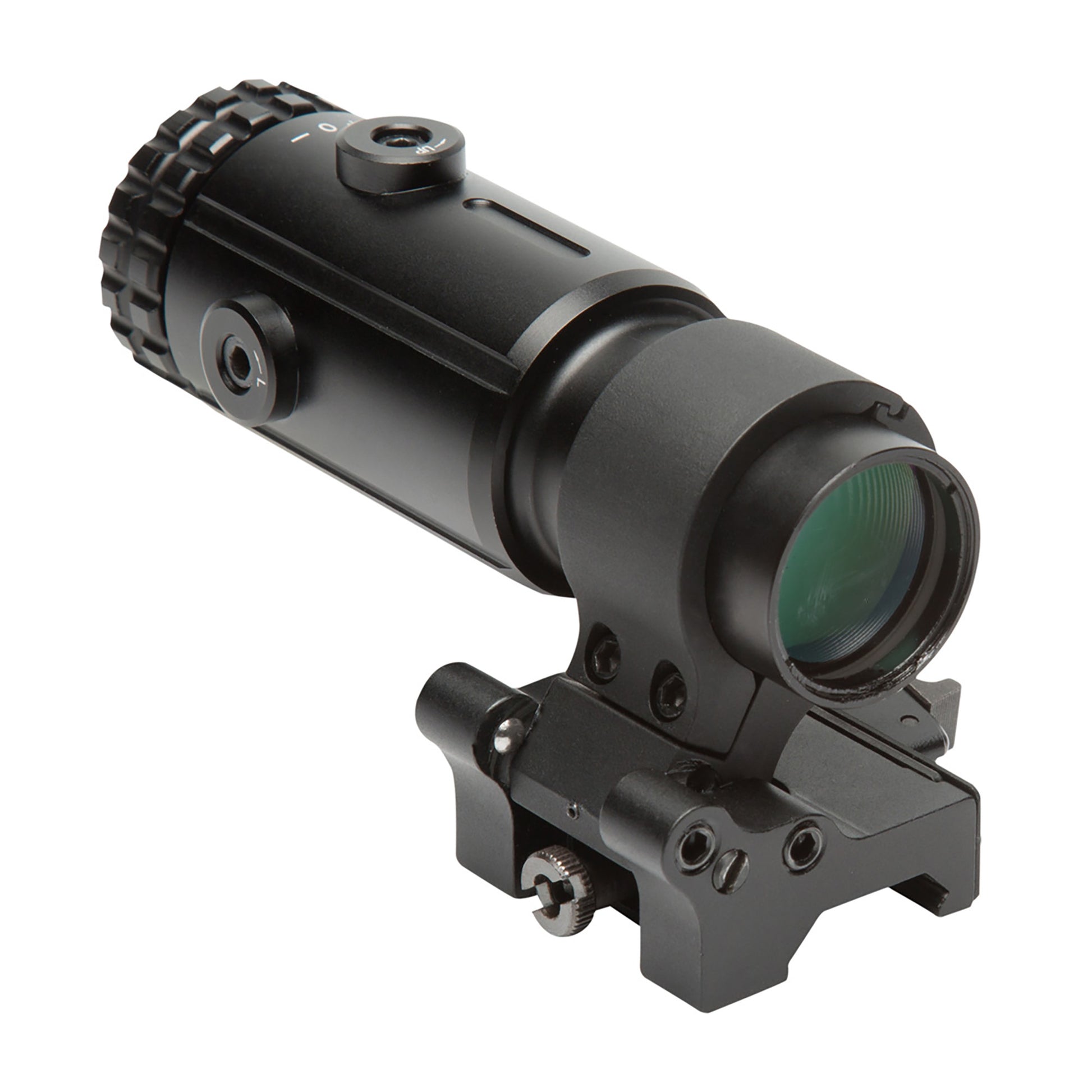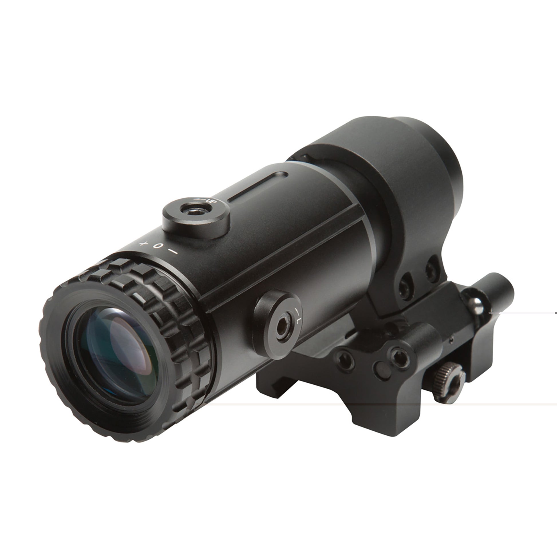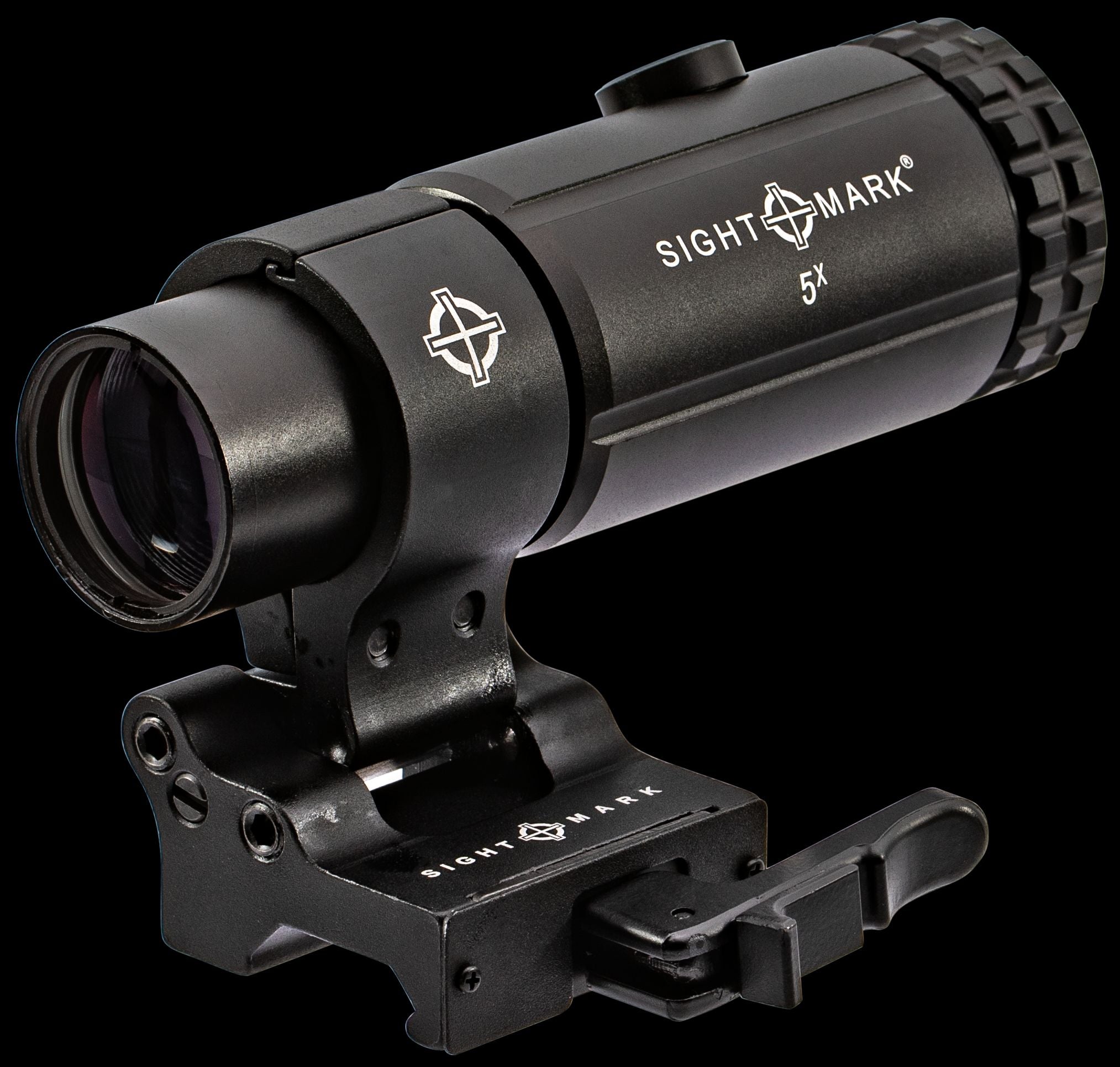 Built for shooting versatility, the Sightmark T-5 is a magnifier that mounts behind a reflex sight or red dot and provides an absolute co-witness. Instantly change the magnification of your close range optic from 1x to 5x by using the T-5s flip to side mount. The magnifiers streamlined, low drag design prevents it from snagging on clothing and equipment and makes the T-5 .7" shorter than the magnifier its replacing. Ideal for stretching your AR engagements out to 200 yards, an included LQD mount allows for rapid attaching/detaching in intense shooting situations. The T-5s aluminum construction is shockproof up to .308 caliber rifles and provides IP55 water resistant protection. Brightness and resolution are improved from fully multi-coated optics and external windage and elevation adjustments help shooters align the reticle of their red dot/reflex sight to the center of the magnifiers point of view. The Sightmark T-5 includes flip-to-side LQD mount, adjustment tools and manual.
