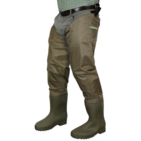 The Slipstream PVC cleated hip boot is 100% waterproof with attached molded boot. Coupled with a puncture resistant nylon outer shell for added durability. Additionally a tough PVC coating for the ultimate waterproof protection. Cleated PVC outsole is ideal for fishing, hunting, ATV, or just puddle jumping. Lastly, the Slipstream hip boots feature a belt leash with quick release buckle for a no-slip fit.
