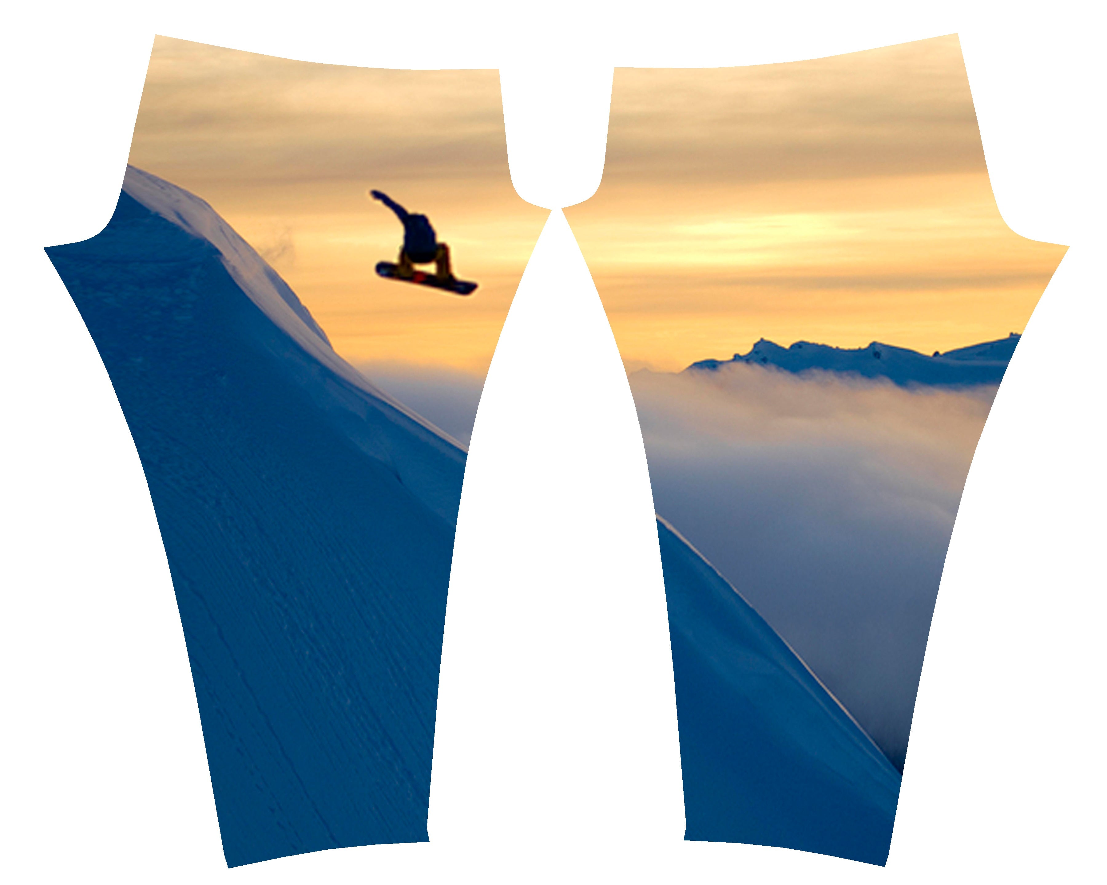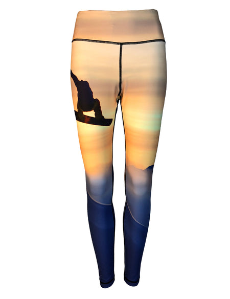 An incredible snowboarder soaring at sunset photographic print on a performance yoga-style legging. We make the best women's outdoor skiing, snowboarding, hiking, and climbing clothing available. Wear as wader liners, long underwear, workout leggings, or for a night on the town. Our outdoor apparel works well as hiking clothes on the trail or as a base layer for active sports. Moisture wicking apparel with great sun protection.