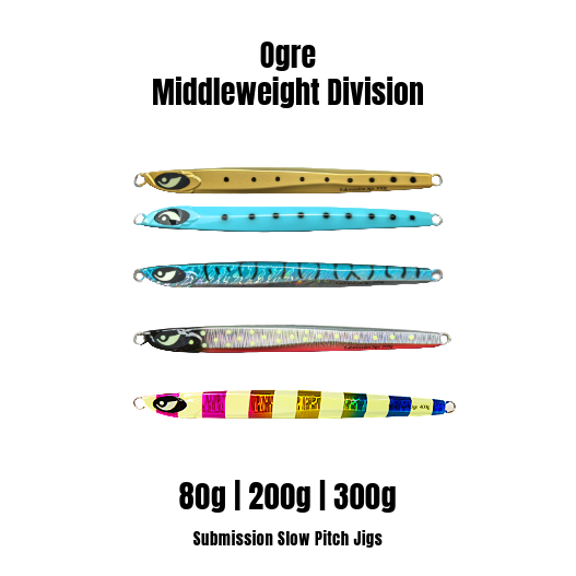Ogre Middleweight Division - 80g, 200g and 300g. These jigs love to hunt bluefin, yellowtail, rockfish, or grouper, to name a few.