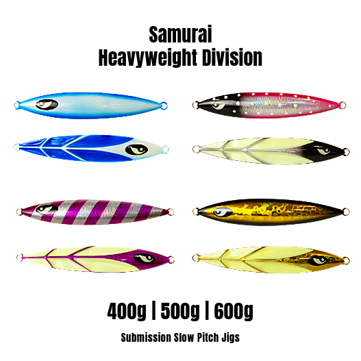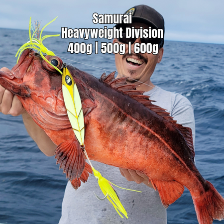 Samurai Heavyweight Division - 400g, 500g, and 600g. These jigs go deep for the deep predators: bluefin, grouper, rockfish, tilefish, and more.