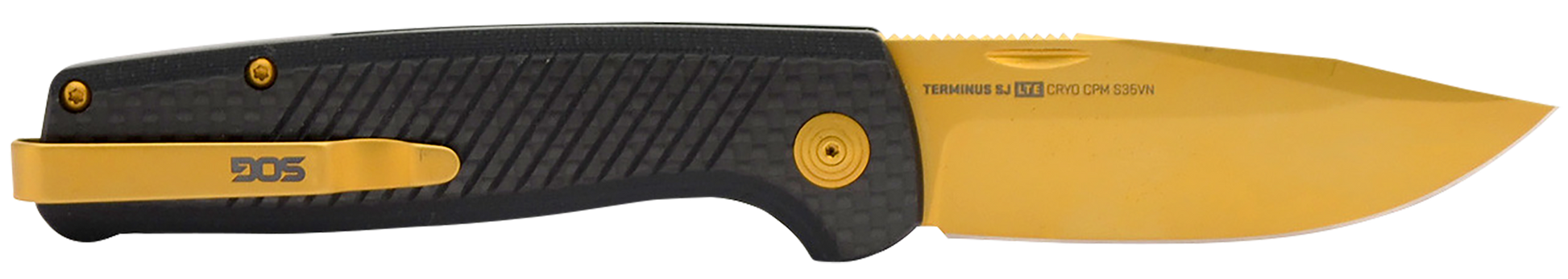 Ideal for hunting, camping, and fishing, the design delivers dependable performance for cutting rope, preparing camp meals, and general field tasks. Specifically designed to be legal around the globe, Terminus SJ LTE is a thin, lightweight knife for daily carry. SOGs slip joint design offers effortless open and close, its high-quality S35VN blade is just under 3" and the carbon fiber reinforced G10 handle allows it to come in at just over two ounces.